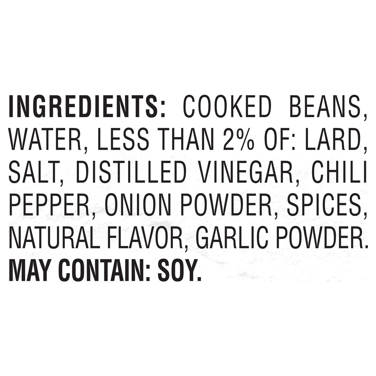 Cooked Beans, Water, Less than 2% of: Lard, Salt, Distilled Vinegar, Chili Pepper, Onion Powder, Spices, Natural Flavor, Garlic Powder.