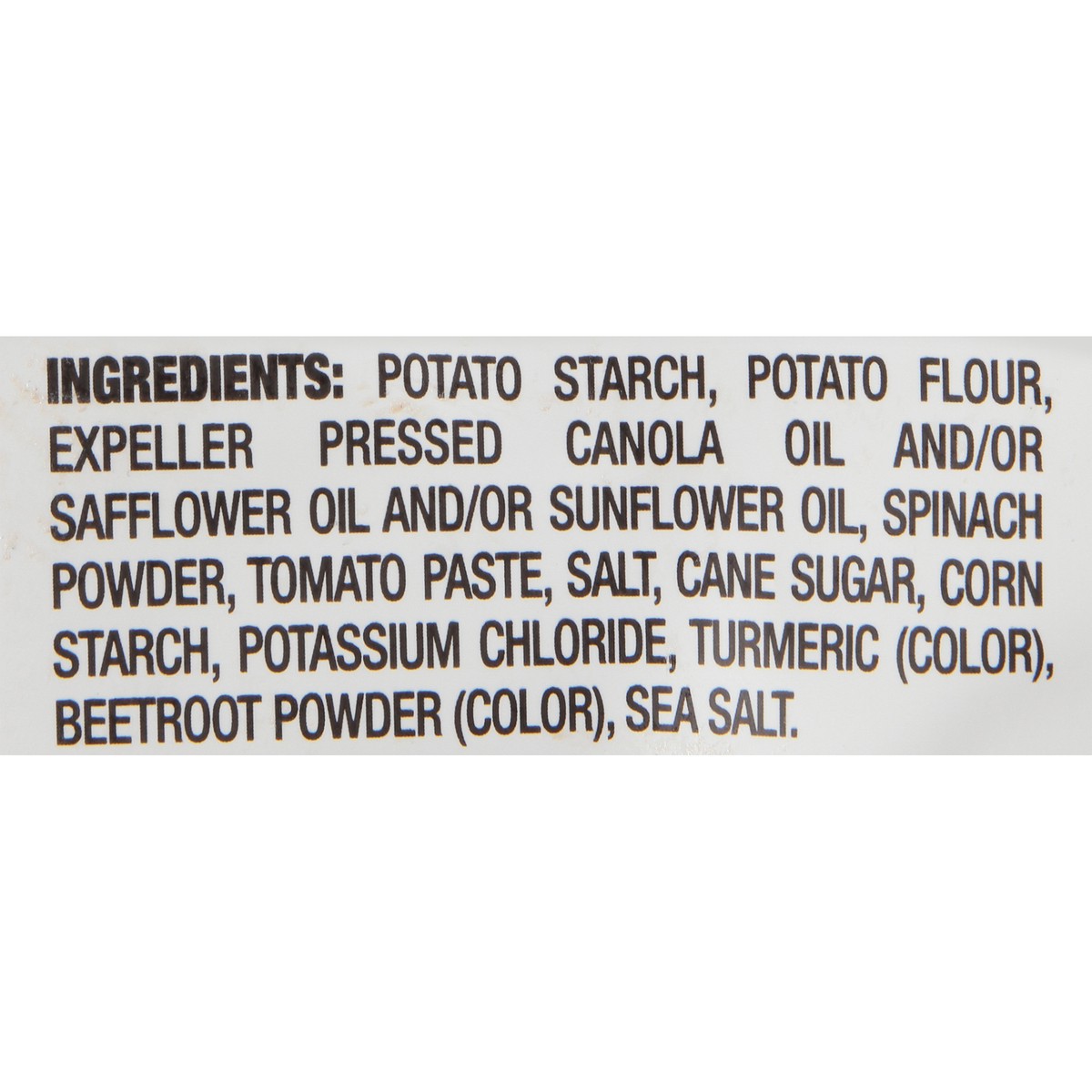 Potato Starch, Potato Flour, Expeller Pressed Canola Oil and/or Safflower Oil and/or Sunflower Oil, Spinach Powder, Tomato Paste, Salt, Cane Sugar, Corn Starch, Potassium Chloride, Turmeric (Color), B…