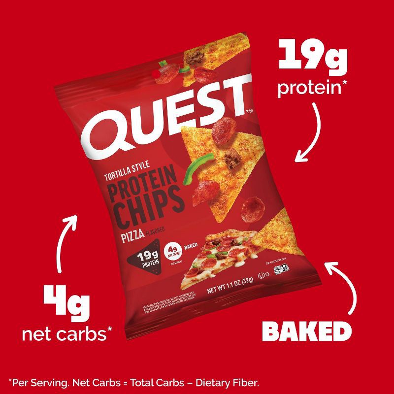 - HACK YOUR SNACK. Quest Pizza Flavored Tortilla Style Protein Chips are baked. And with 4g of net carbs* they bring the bold pizza favor and fantastic crunch that keeps you reaching for more.
