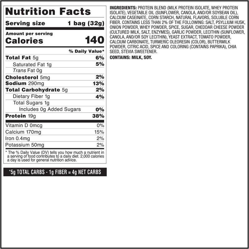 - PROTEIN FORWARD. 19g of protein and 4g of net carbs*. They're the wonderfully crunchy, easy-breezy cheat to support your protein goals while living the pizza dream.