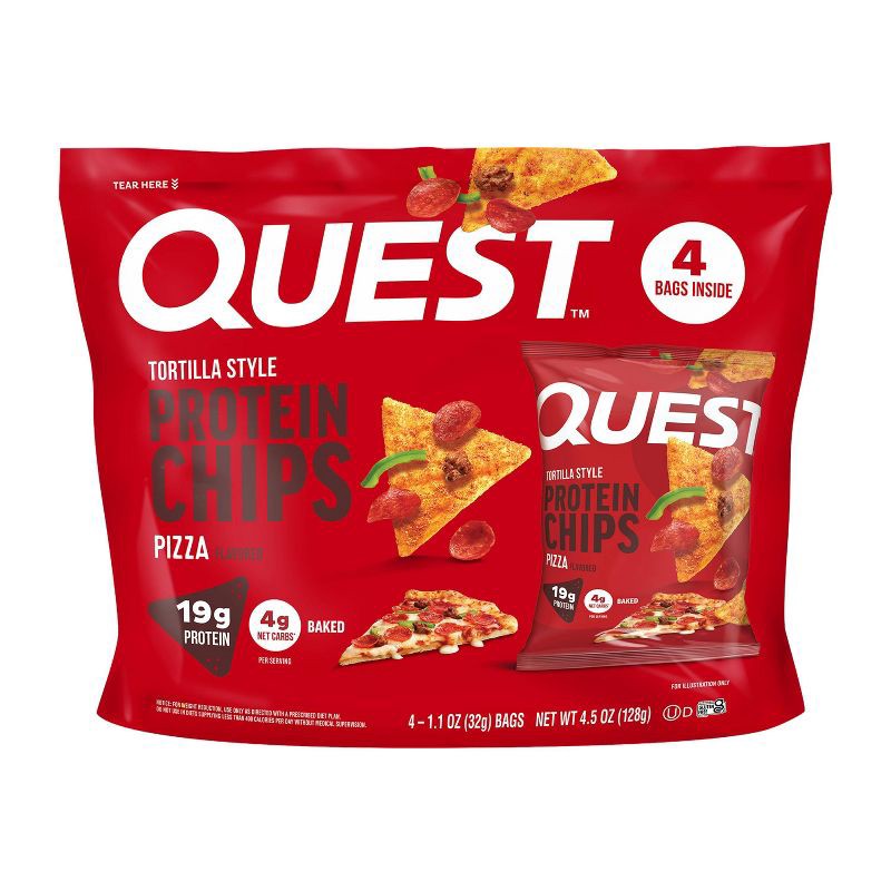 - AT HOME OR ON-THE-GO. Quest Pizza Flavored Tortilla Style Protein Chips with 19g of grab & go protein* are just right for the afternoon commute, as a tasty treat at your desk, or a delicious way to refuel after a workout.