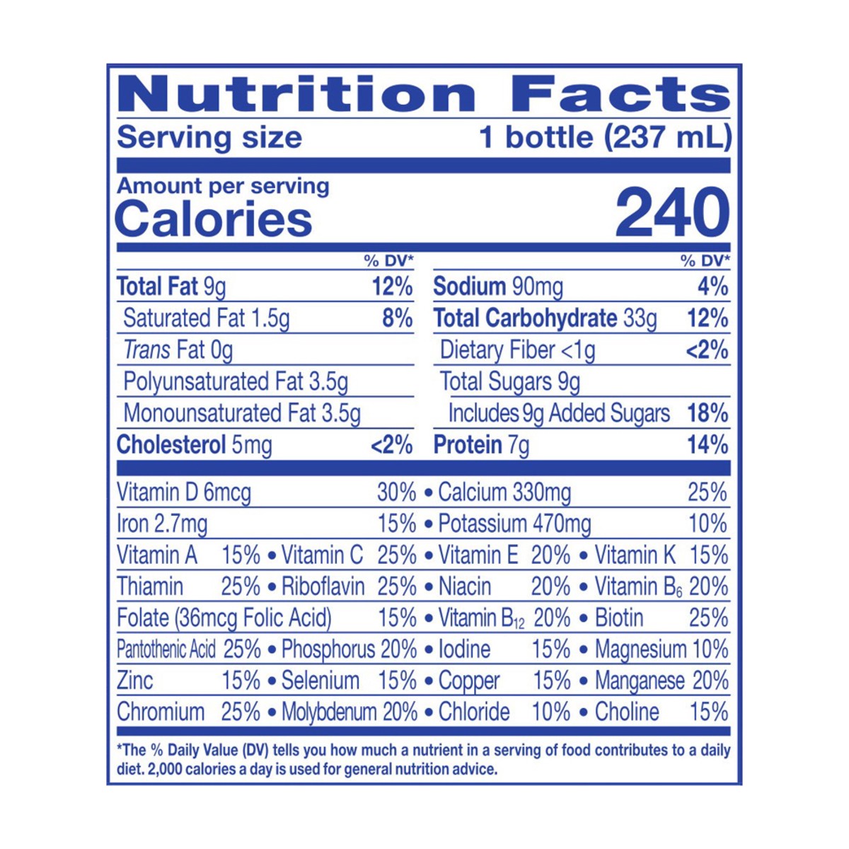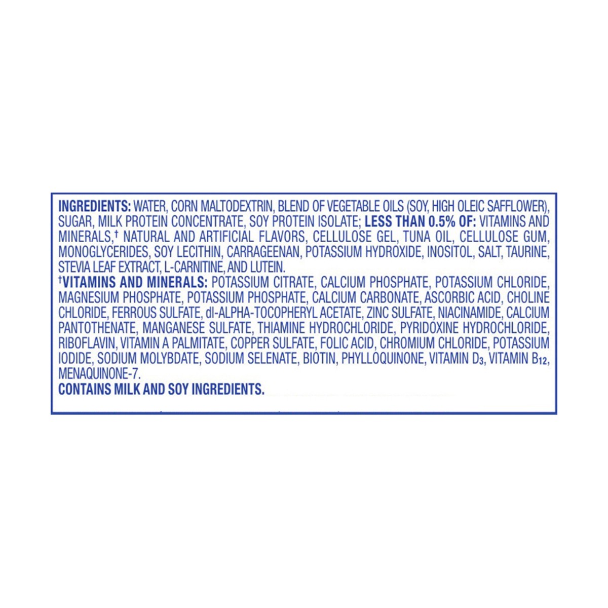 Water, Corn Maltodextrin, Sugar, Blend of Vegetable Oils (Canola, Corn), Milk Protein Concentrate, Soy Protein Isolate, Nonfat Milk, Less than 0.5% of: Vitamins & Minerals (Potassium Citrate, Calc…