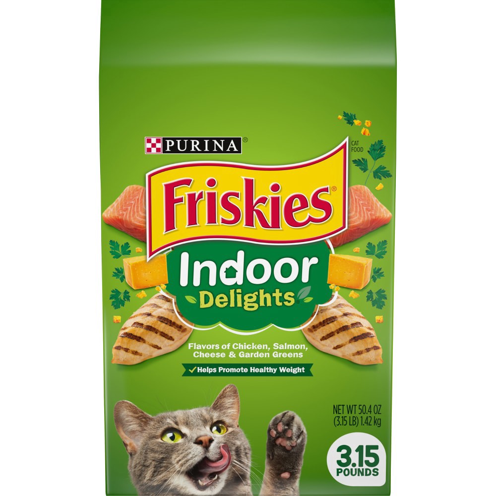 Give your indoor cat an exciting mealtime adventure with Purina Friskies Indoor Delights adult dry cat food. A combination of appealing shapes tantalizes her palate, while a combination of salmon, chi…