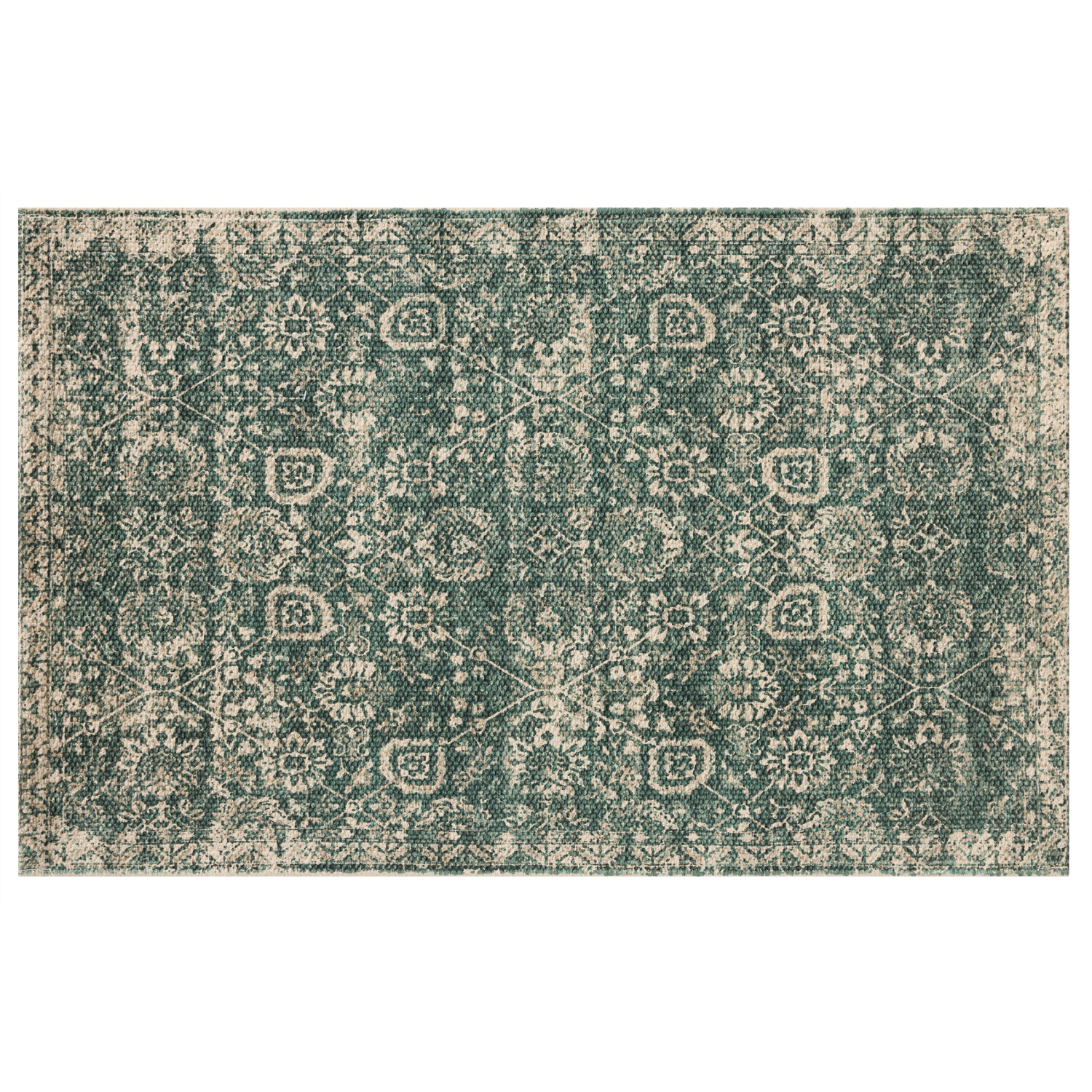 The distressed green tones and Persian design of this McKenna rug will add a calming finishing touch to your home. With its low profile and skid-resistant qualities, its ideal for your most high-traff…