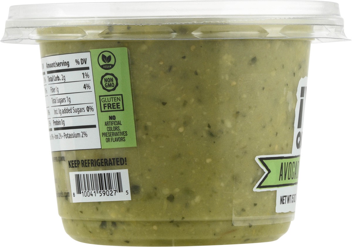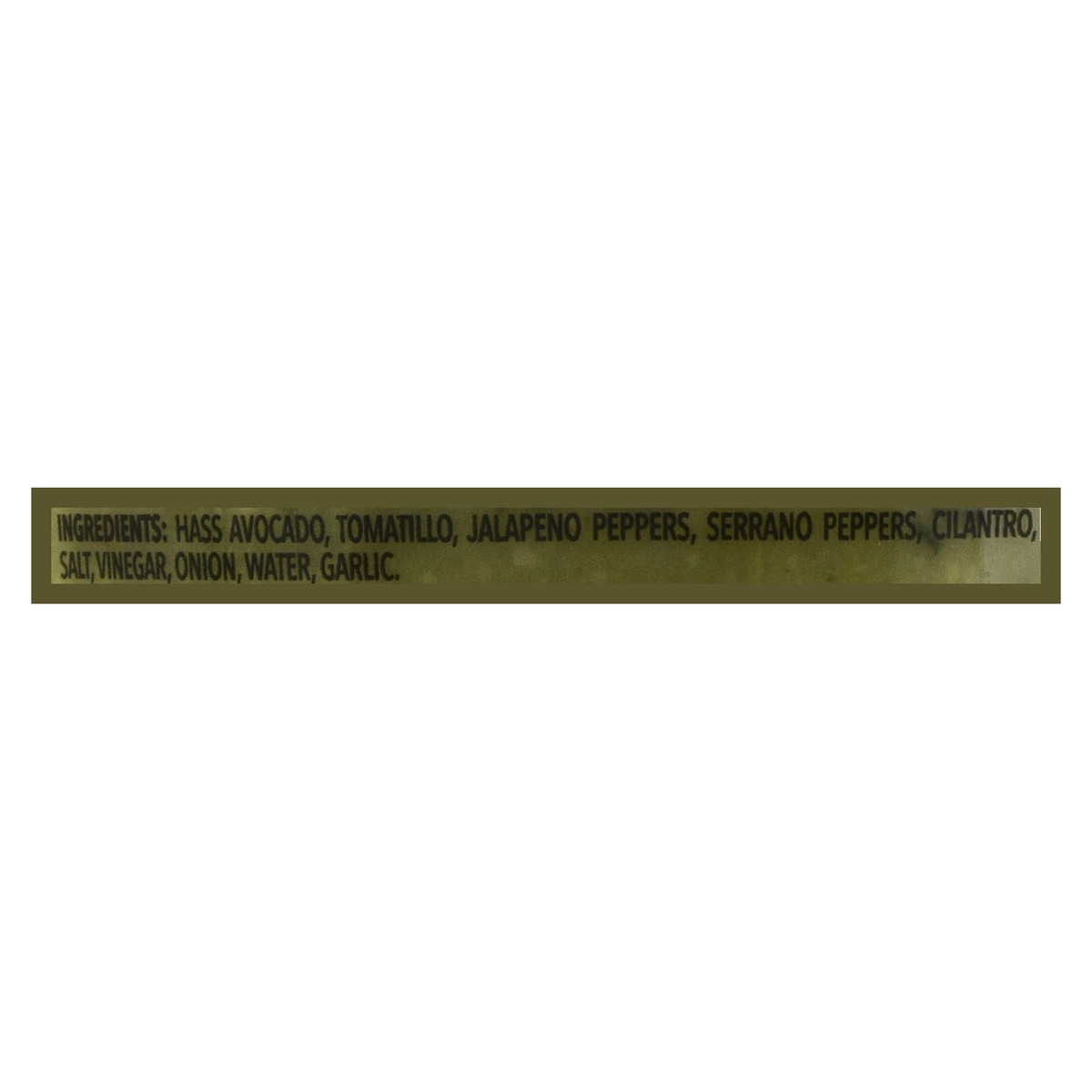 Hass Avocado, Tomatillo, Jalapeno Peppers, Serrano Peppers, Cilantro, Salt, Vinegar, Onion, Water, Garlic.