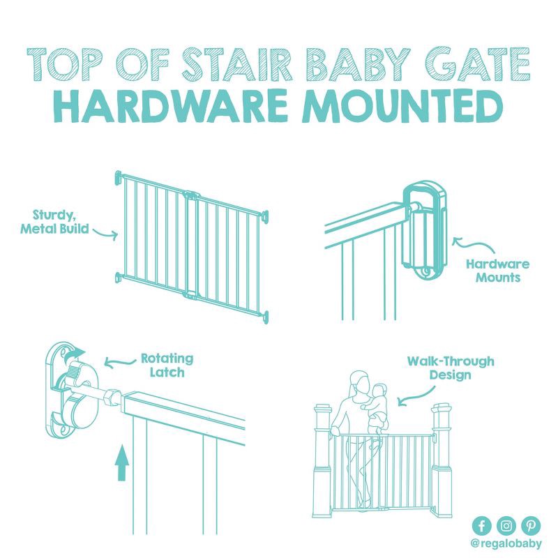 The Regalo® Top of Stair Baby Gate is a sleek, sturdy, and effective way to protect your little one.The gate makes use of a hinge system with a simple rotating latch to create a secure fit and easy wa…