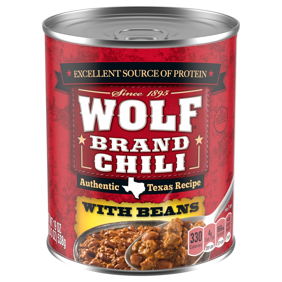If chili's not on tonight's menu, it should be. Purchase a 19-ounce can of WOLF BRAND Chili With Beans to feed your hungry pack. The original, authentic Texas recipe dates back to 1895. Today, this ca…