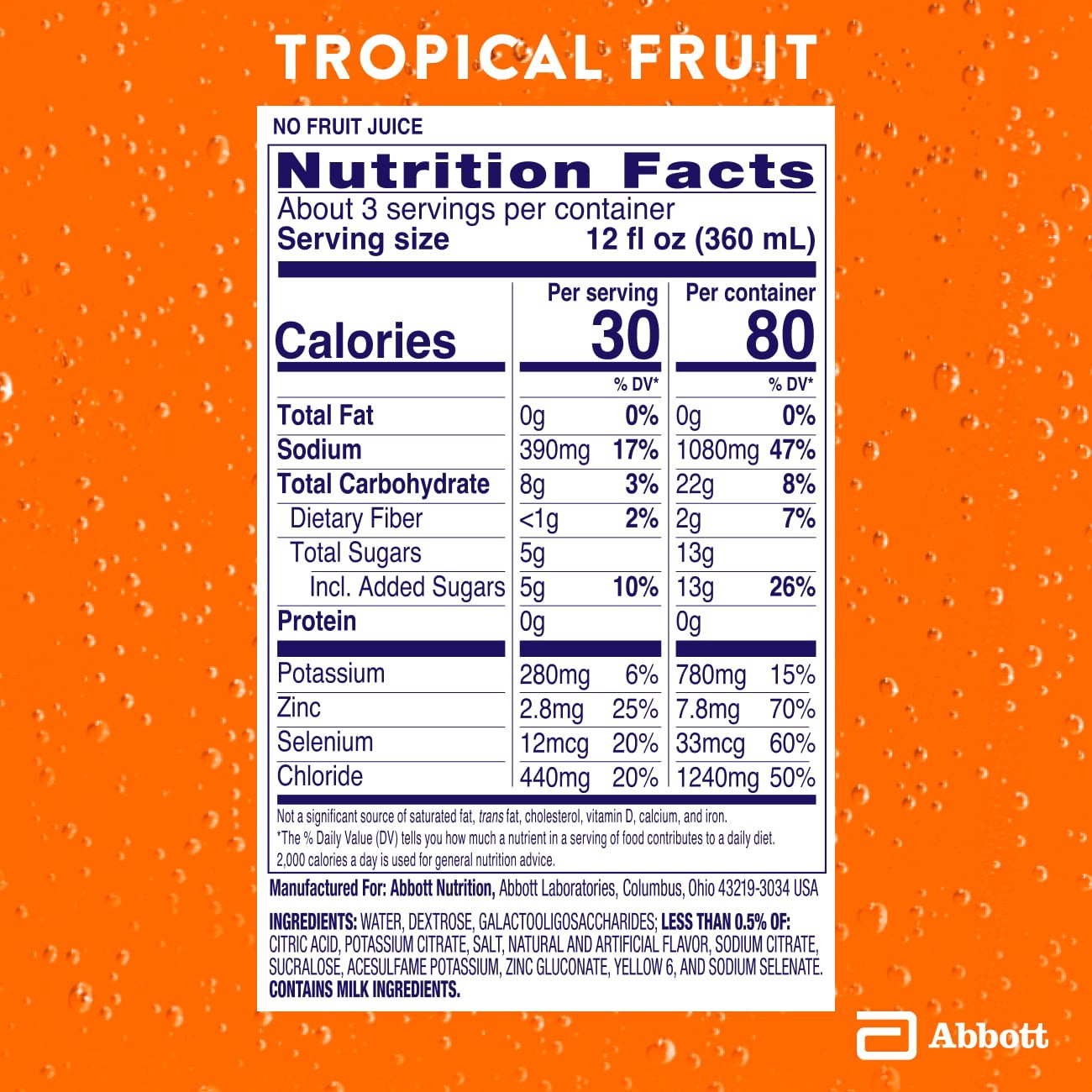 Water, Dextrose, Galactooligosaccharides. Less than 0.5% of: Citric Acid, Potassium Citrate, Salt, Natural and Artificial Flavor, Sodium Citrate, Sucralose, Acesulfame Potassium, Zinc Gluconate, Yello…
