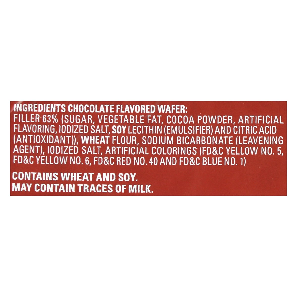 Ingredients Chocolate Flavored Wafer: Filler 63% (Sugar, Vegetable Fat, Cocoa Powder, Artificial Flavoring, Iodized Salt, Soy Lecithin (Emulsifier) and Citric Acid (Antioxidant)), Wheat Flour, Sodium …