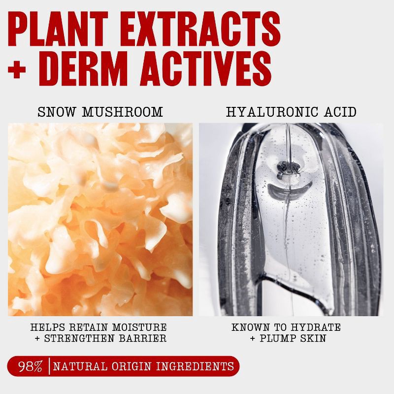 - 98% Natural Origin Ingredients: Formulated with snow mushroom and hyaluronic acid to hydrate and strengthen moisture barrier as it cleanses without stripping skin; we fuse natural plant ingredients with derm actives for real results to i.mprove overall skin quality.