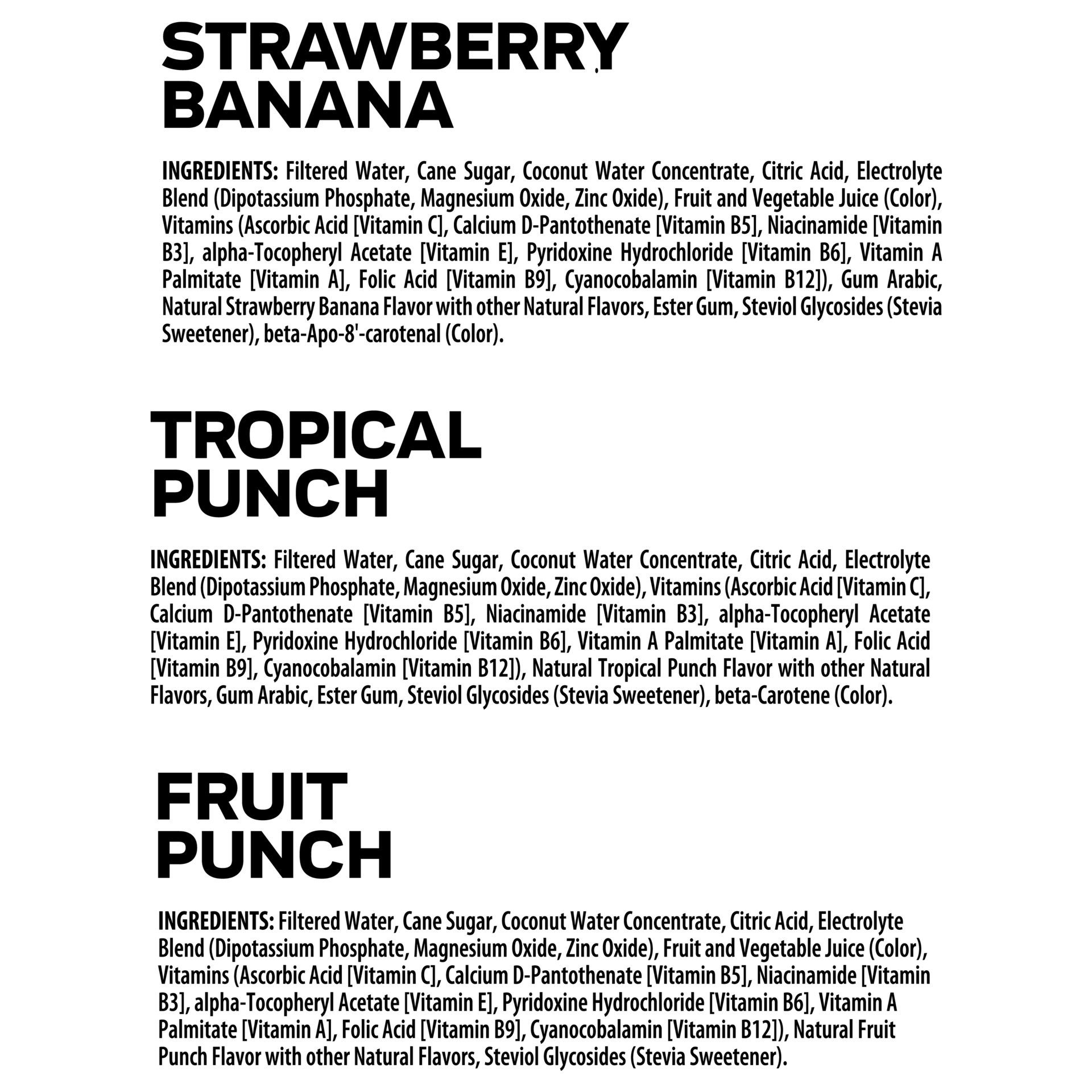 Strawberry Banana: Filtered Water, Cane Sugar, Coconut Water Concentrate, Citric Acid, Electrolyte Blend (Dipotassium Phosphate, Magnesium Oxide, Zinc Oxide), Fruit and Vegetable Juice (Color), Vitami…
