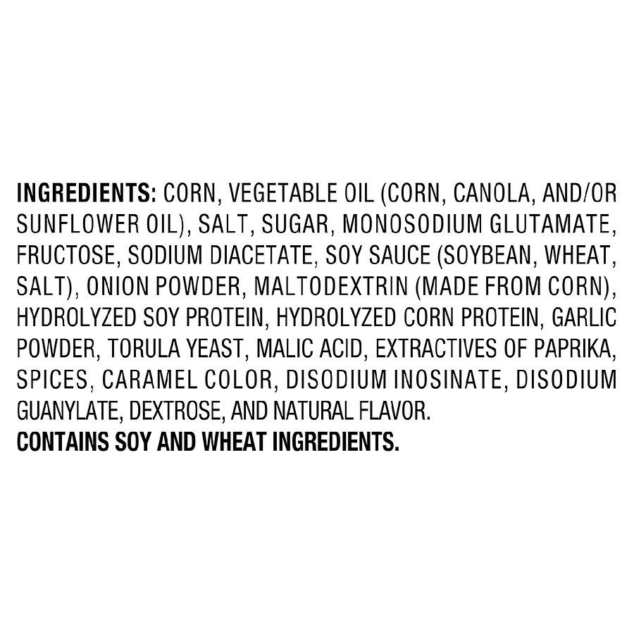 Corn, Vegetable Oil (Corn, Canola, and/or Sunflower Oil), Salt, Sugar, Monosodium Glutamate, Fructose, Sodium Diacetate, Soy Sauce (Soybean, Wheat, Salt), Onion Powder, Maltodextrin (Made from Corn), …