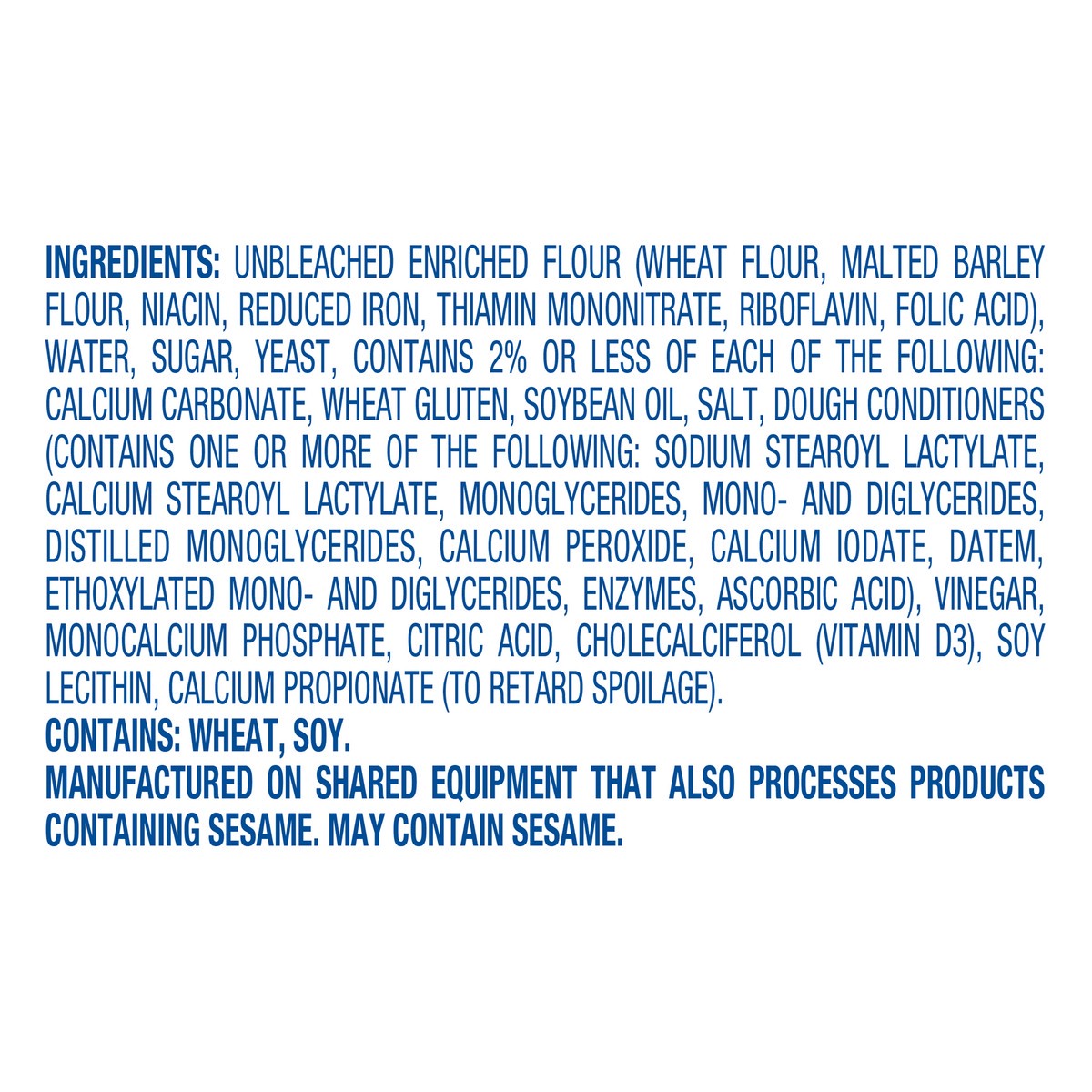 Unbleached Enriched Flour (Wheat Flour, Malted Barley Flour, Niacin, Reduced Iron, Thiamin Mononitrate, Riboflavin, Folic Acid), Water, Sugar, Yeast, Contains 2% or Less of Each of the Following: Calc…
