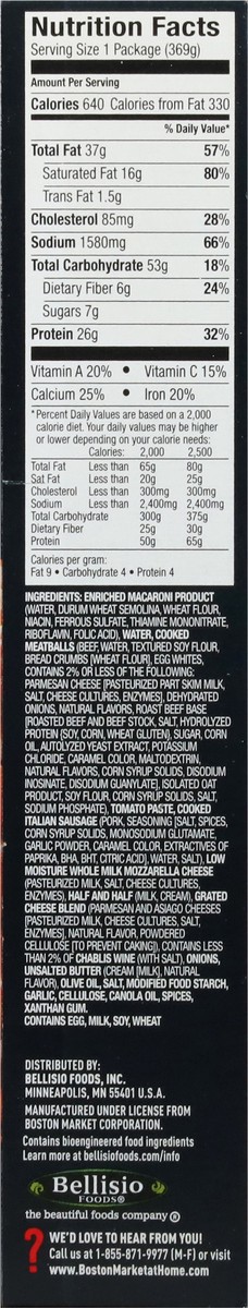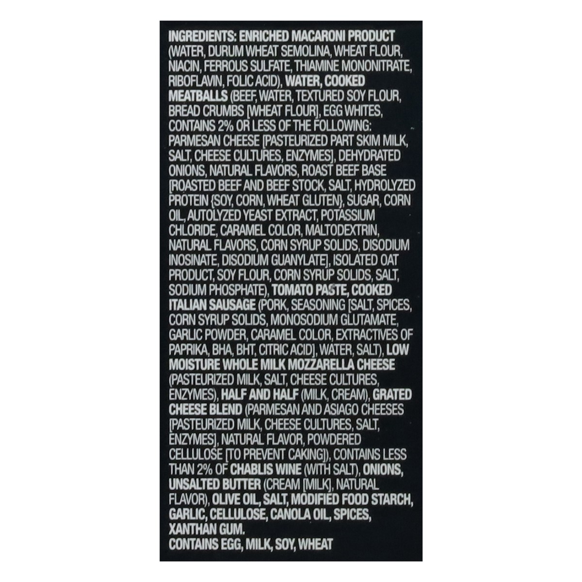 Enriched Macaroni Product (Water, Durum Wheat Semolina, Wheat Flour, Niacin, Ferrous Sulfate, Thiamine Mononitrate, Riboflavin, Folic Acid), Water, Cooked Meatballs (Beef, Water, Textured Soy Flour, B…