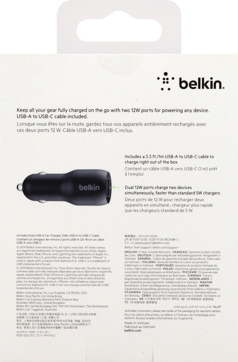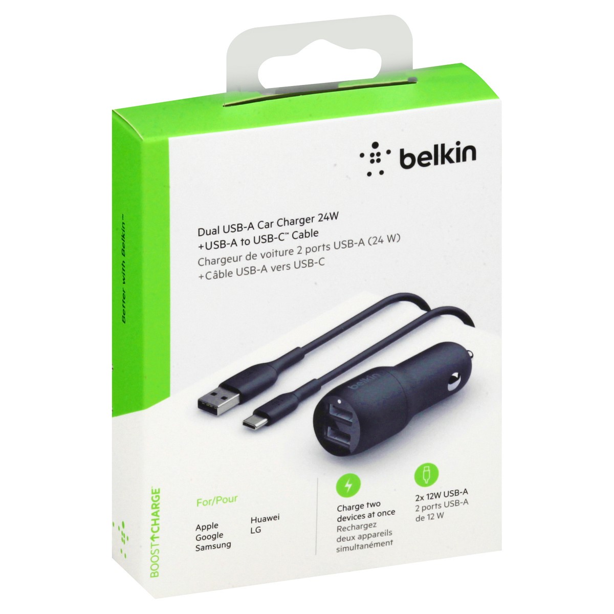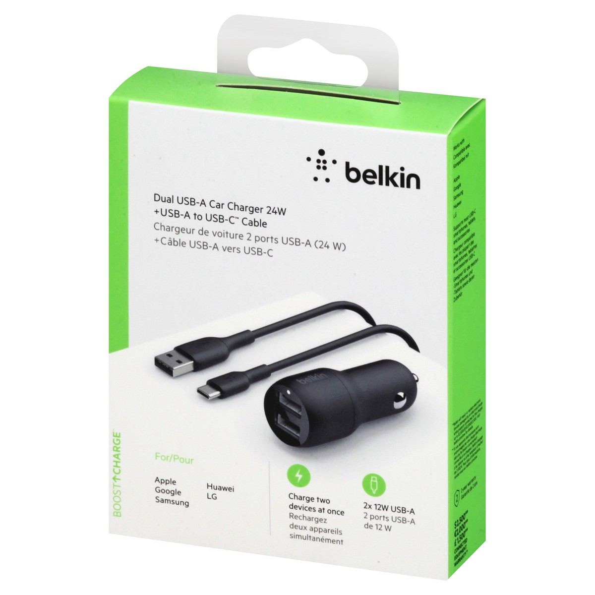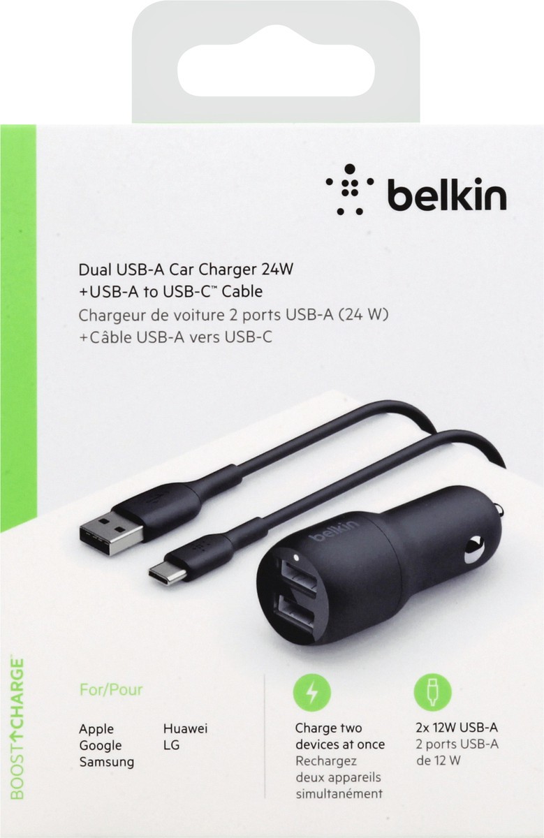 Includes dual USB-A car charger 24 W, USB-A to USB-C cable. +USB-A to USB-C cable.For Apple; Google; Samsung; Huawei; LG. Charge two devices at once. 2x 12W USB-A. Boost charge. Keep all your gear ful…