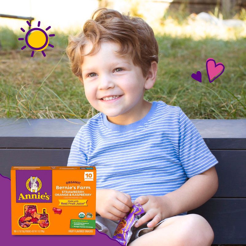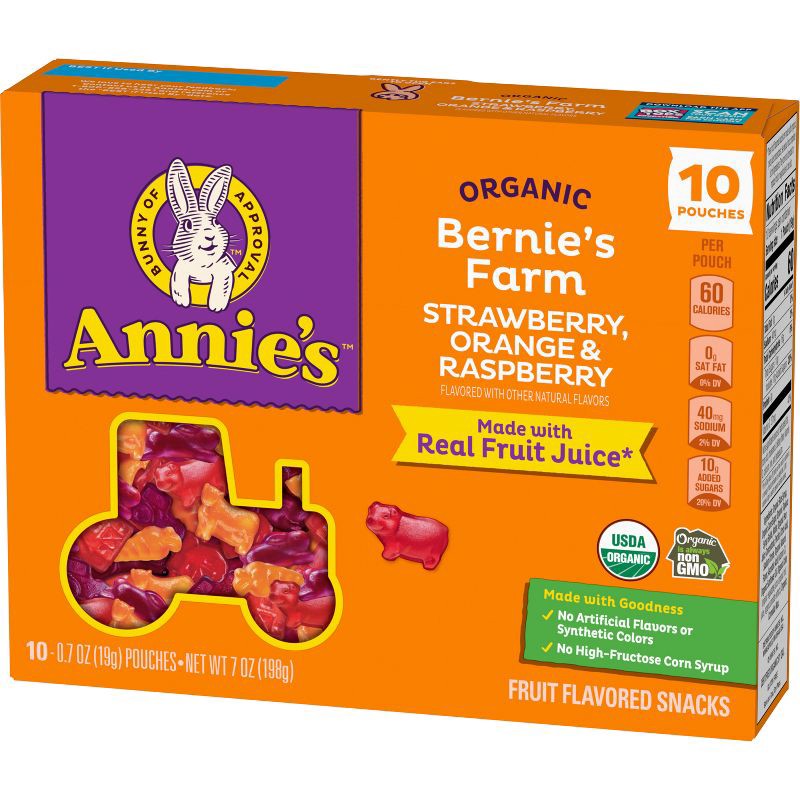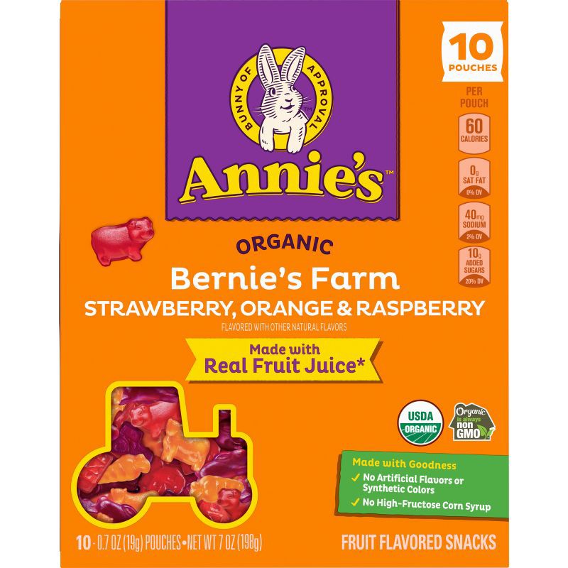 - CONTAINS: One 7 oz box of Annie's Organic Bernie's Farm Gluten Free Fruit Flavored Snacks; 10 pouches