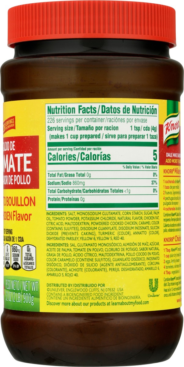 Per 1 Tsp Serving: 5 calories; 0 g sat fat (0% DV); 860 mg sodium (37% DV); 0 g total sugars. 226 serving per container. www.knorrsabor.com. learnboutmyfood.com. Questions or comments? please call tol…