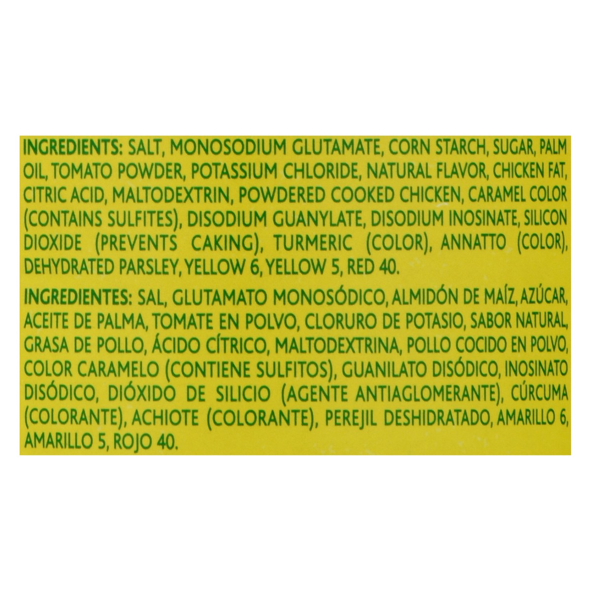 Salt, Monosodium Glutamate, Corn Starch, Sugar, Palm Oil, Tomato Powder, Potassium Chloride, Natural Flavor, Chicken Fat, Citric Acid, Maltodextrin, Powdered Cooked Chicken, Caramel Color (Contains Su…