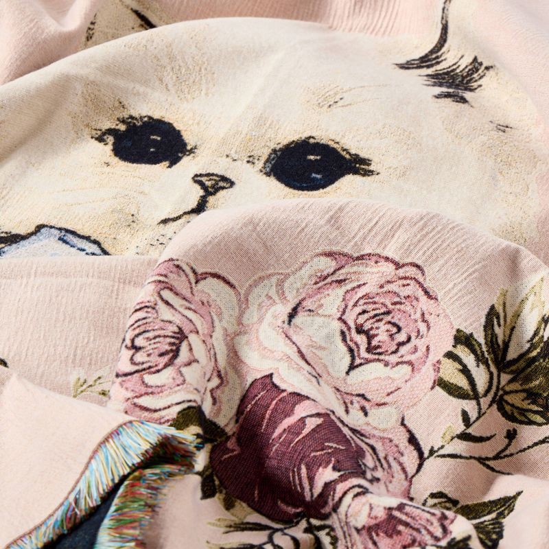 Elevate your lounging space with this cozy Cat Woven Throw. Featuring an adorable cat wearing a blue bow and surrounded by beautiful flowers woven in sustainable RPET polyester. It also features a sel…