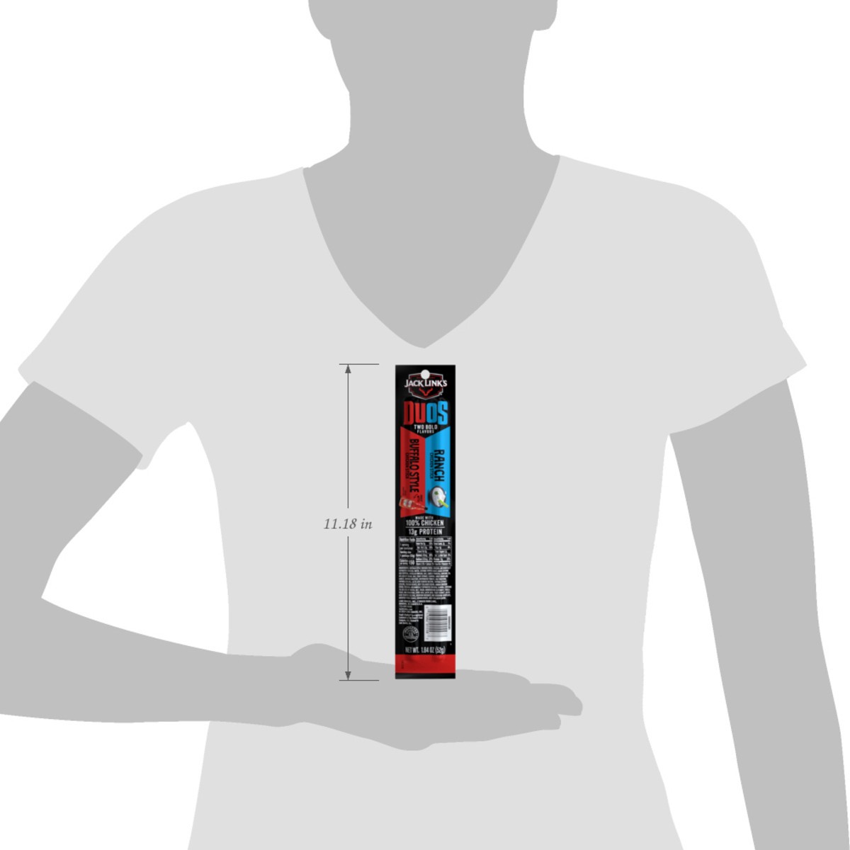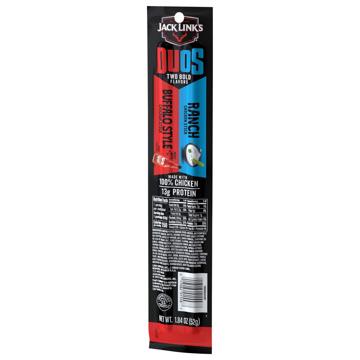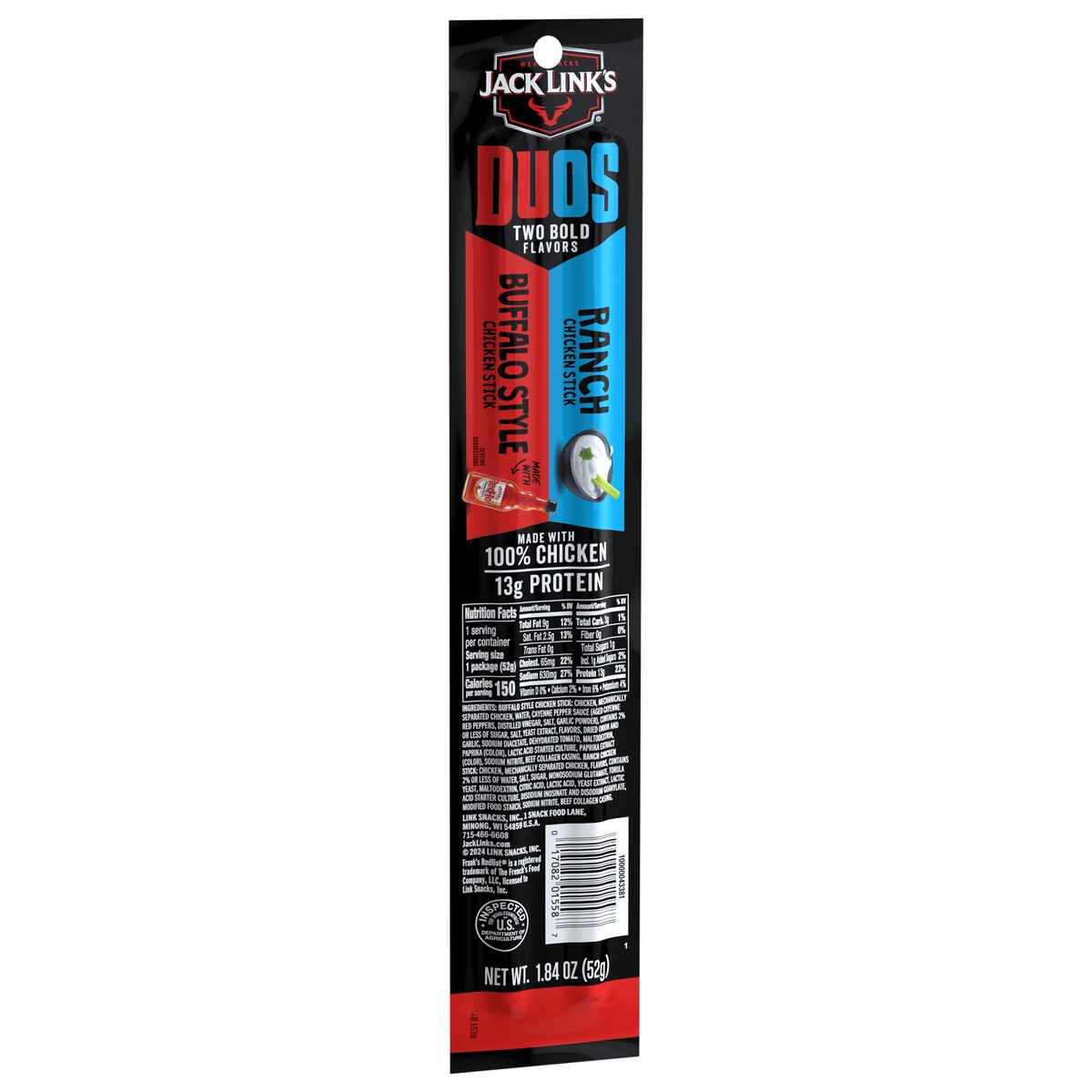 Jack Links DUOs pairs the fiery heat of Buffalo Style with the creamy coolness of Ranch in 100% chicken sticks packed with 13g of protein.