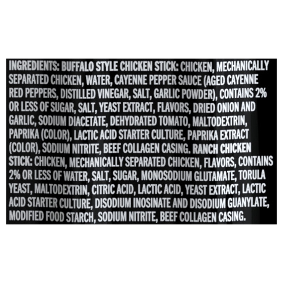 Buffalo Style Chicken Stick: Chicken, Mechanically Separated Chicken, Water, Cayenne Pepper Sauce (Aged Cayenne Red Peppers, Distilled Vinegar, Salt, Garlic Powder), Contains 2% or Less of Sugar, Salt…