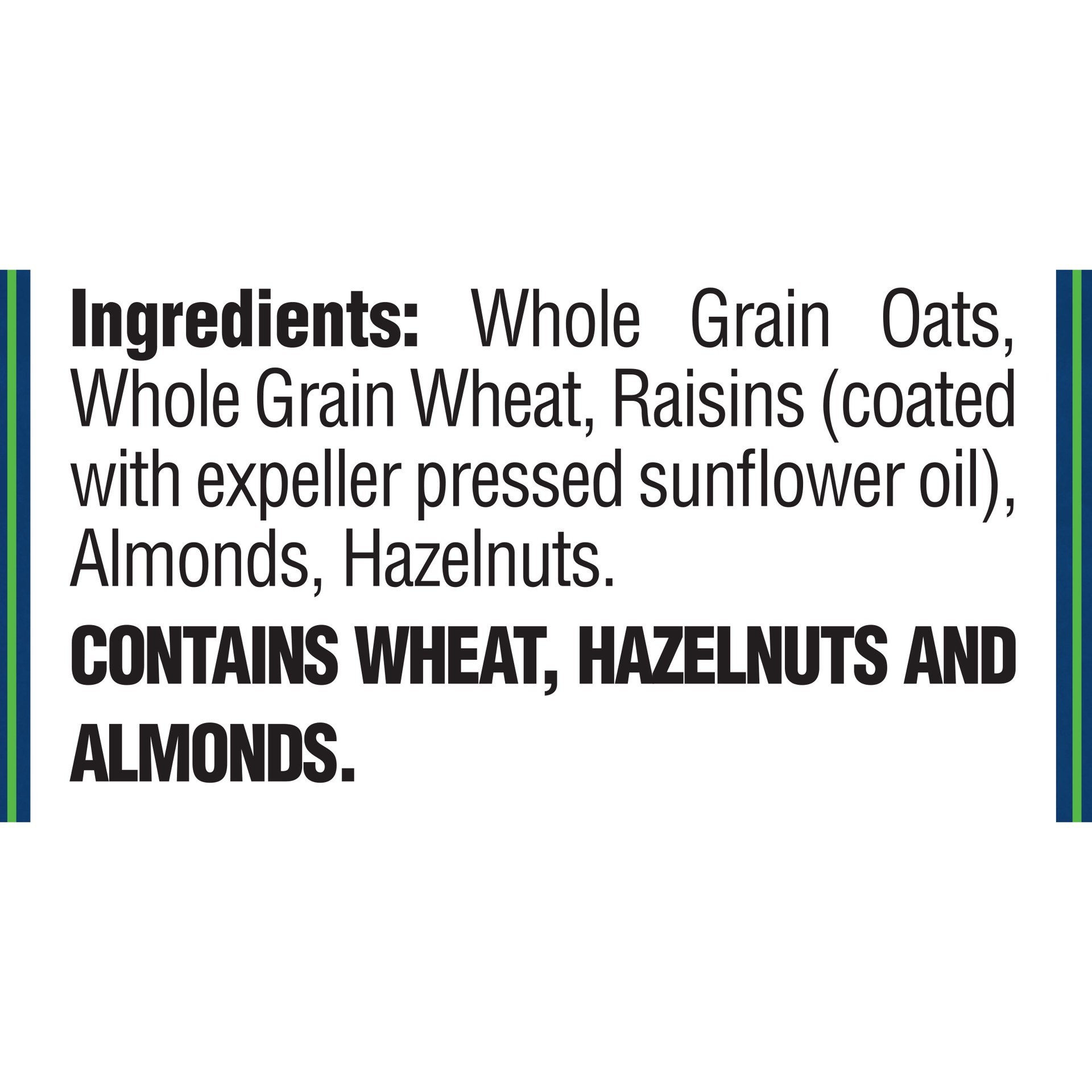 Whole Grain Oats, Whole Grain Wheat, Raisins (Coated with Expeller Pressed Sunflower Oil), Almonds, Hazelnuts.