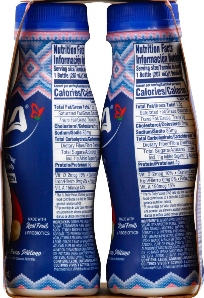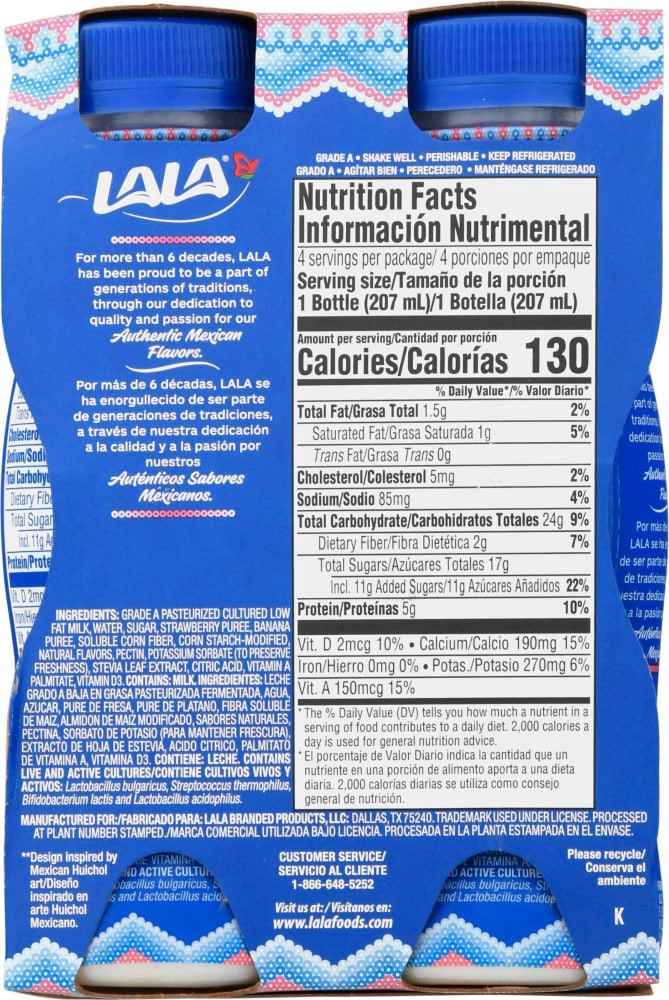 Grade A Pasteurized Cultured Low Fat Milk, Water, Sugar, Strawberry Puree, Banana Puree, Soluble Corn Fiber, Corn Starch-Modified, Natural Flavors, Pectin, Potassium Sorbate (to Preserve Freshness), S…