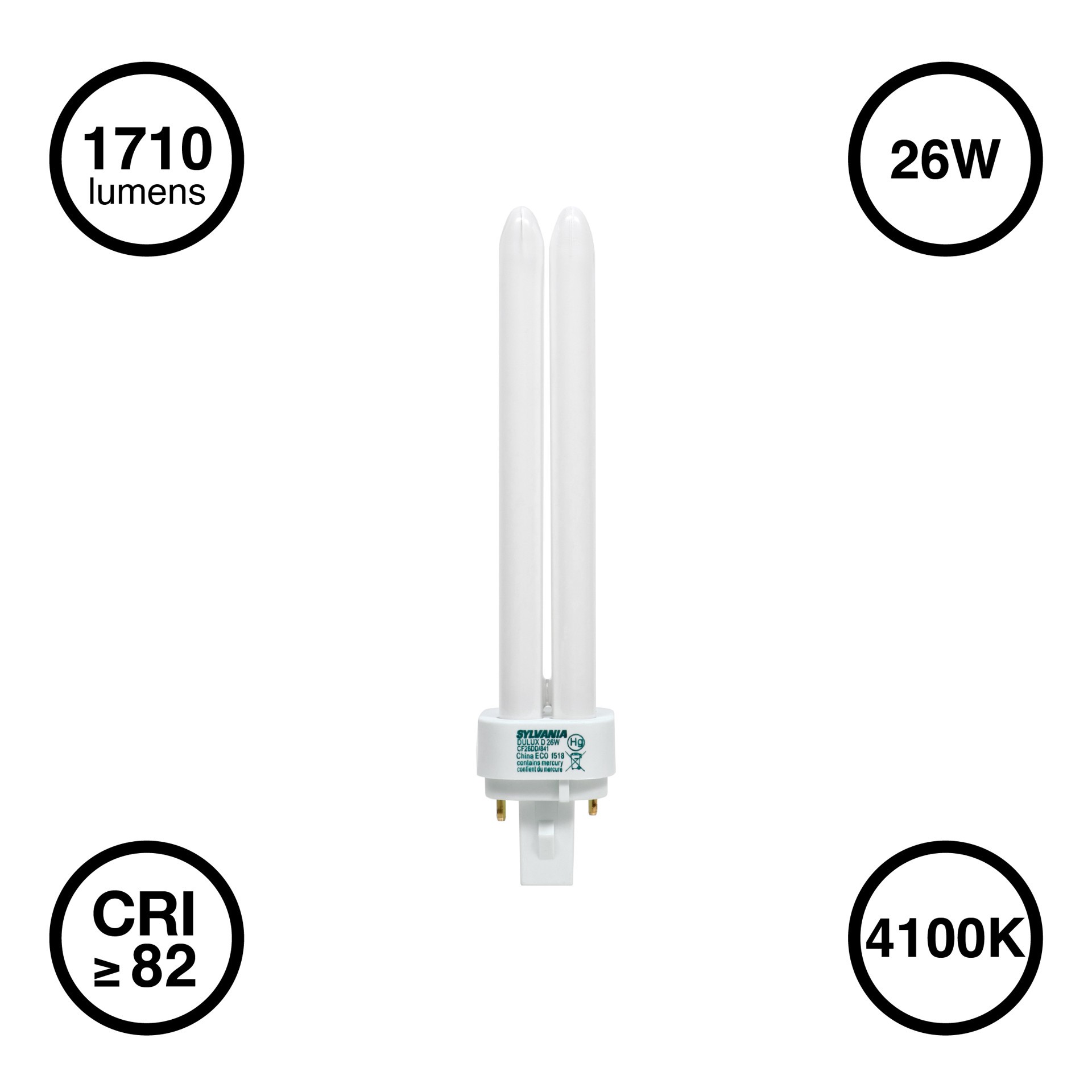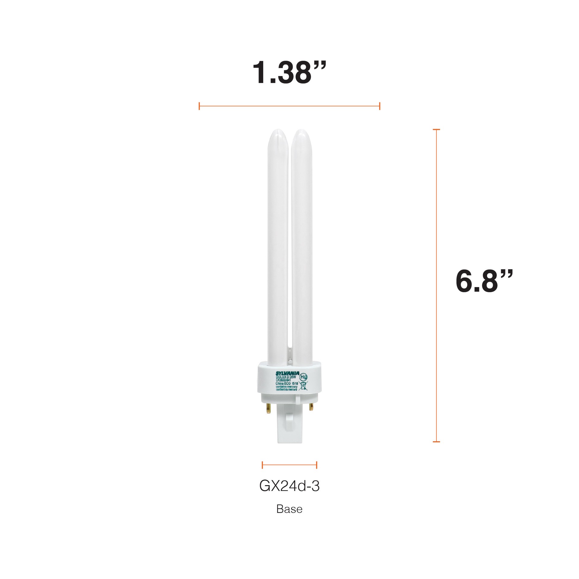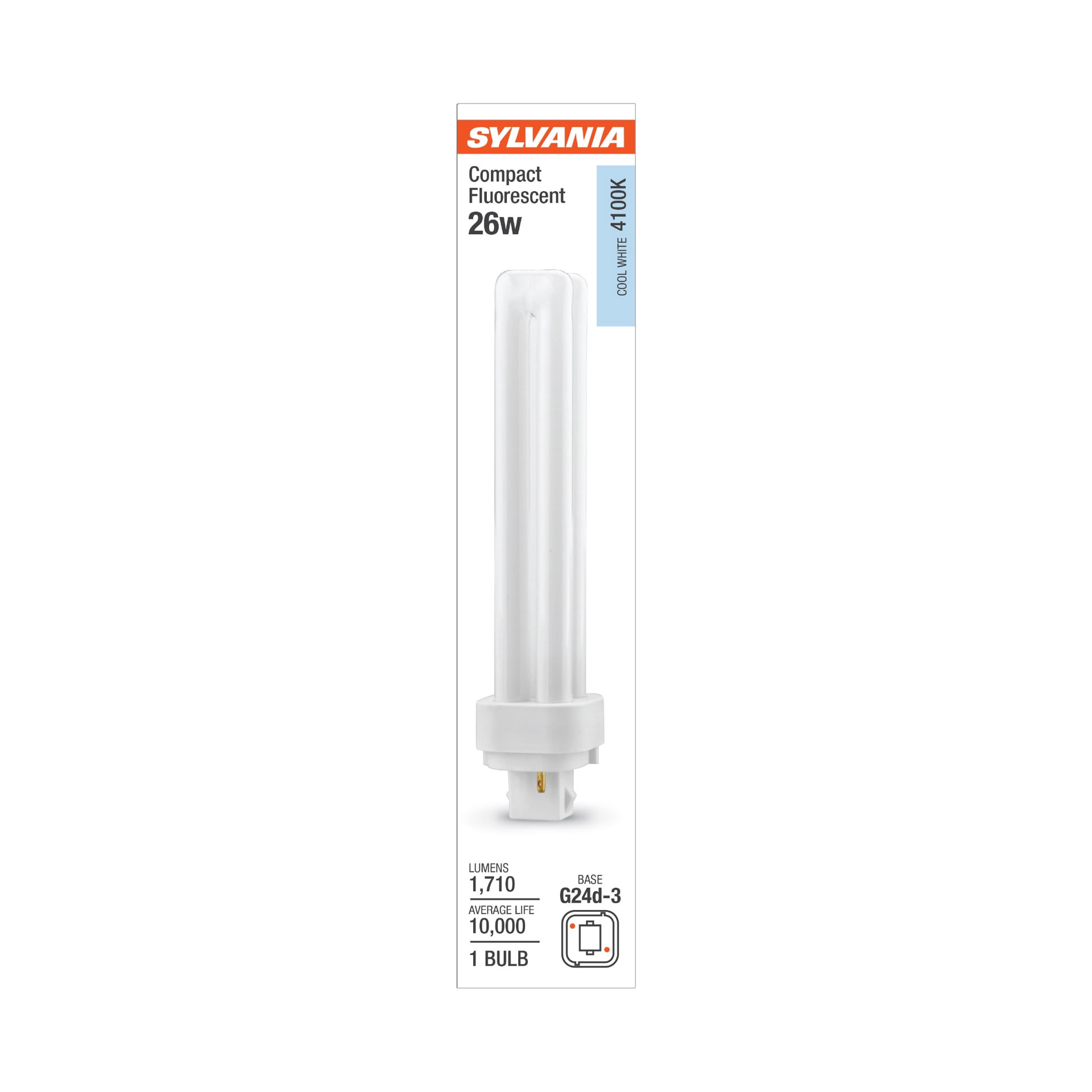 Double tube compact fluorescent lamp with GX24d-2 pin base. T4 bulb shape with a compact 6.8" tube length. Uses only 26 Watts for energy-efficient performance. Rated to last up to 10,000 hours. 4100K …