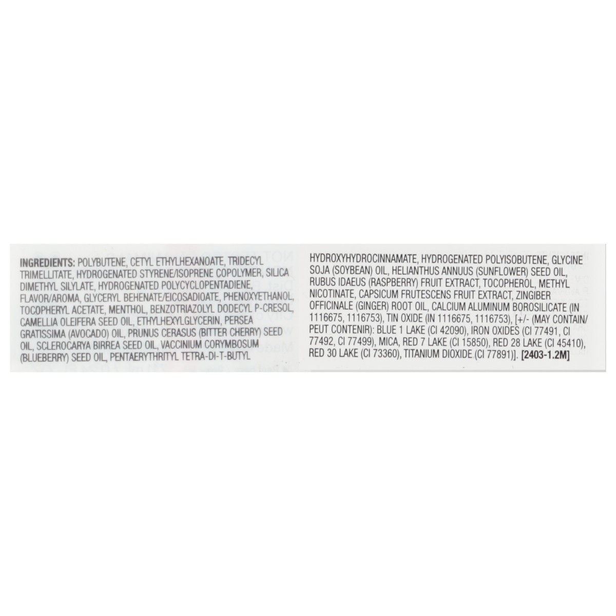 Polybutene, Cetyl Ethylhexanoate, Tridecylom Trimellitate, Hydrogenated Styrene/Isoprene Copolymer, Silica Dimethyl Silylate, Hydrogenated Polycyclopentadiene, Flavor/Aroma, Glyceryl Behenate/Eicosadi…