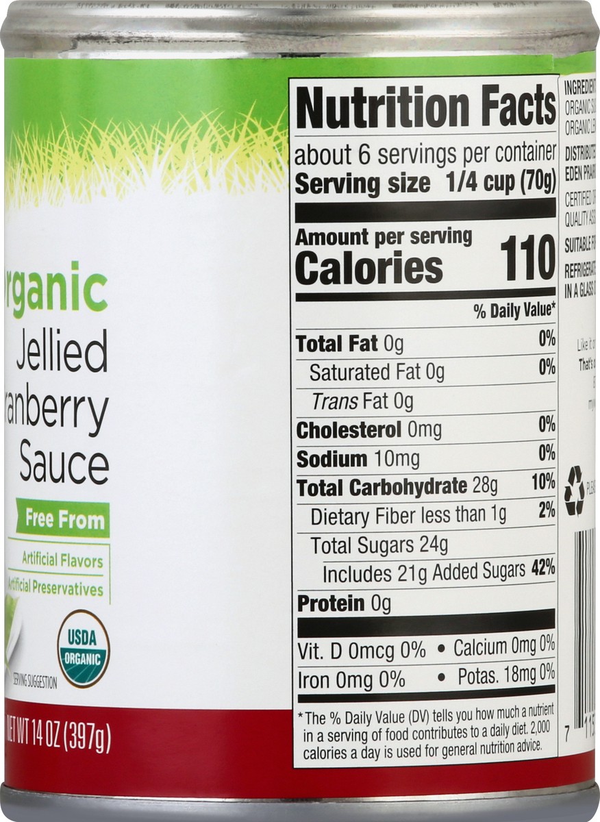 Free from: artificial flavors; artificial preservatives. USDA organic. Per 1/4 Cup: 110 calories; 0 sat fat (0% DV); 10 mg sodium (0% DV); 24 g total sugars. Certified organic by Quality Assurance Int…