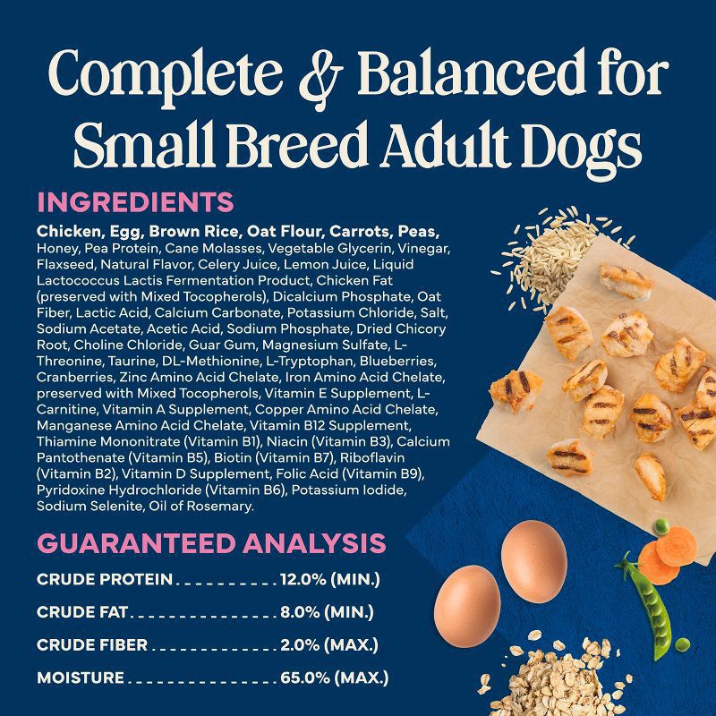 Chicken, Egg, Brown Rice, Oat Flour, Carrots, Peas, Honey, Pea Protein, Cane Molasses, Vegetable Glycerin, Vinegar, Flaxseed, Natural Flavor, Celery Juice, Lemon Juice, Liquid Lactococcus Lactis Ferme…
