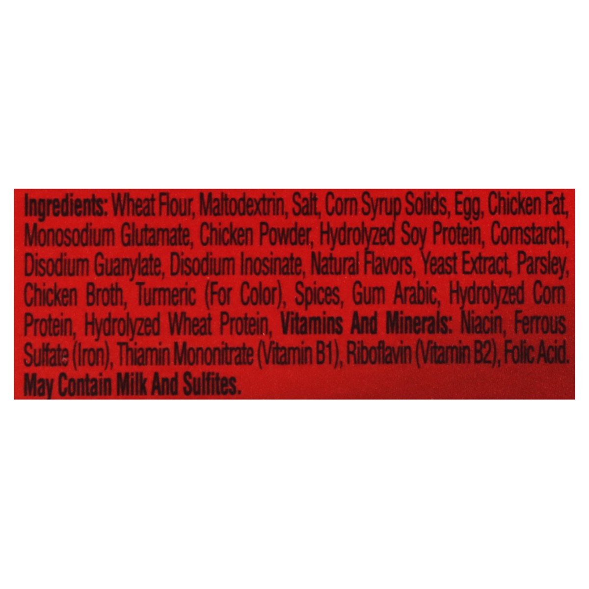 Wheat Flour, Maltodextrin, Salt, Corn Syrup Solids, Eggs, Chicken Fat, Monosodium Glutamate, Chicken Powder, Hydrolyzed Soy Protein, Cornstarch, Disodium Guanylate, Disodium Inosinate, Natural Flavors…