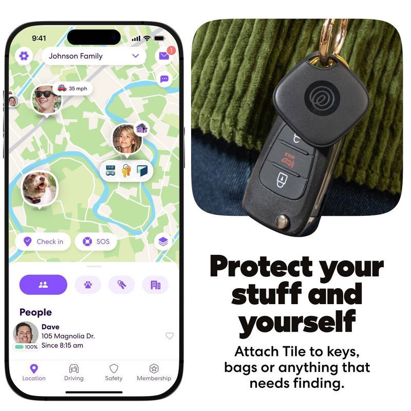 - Tile works seamlessly with Life360 and lets you see all your stuff, people, and pets, all on one map.