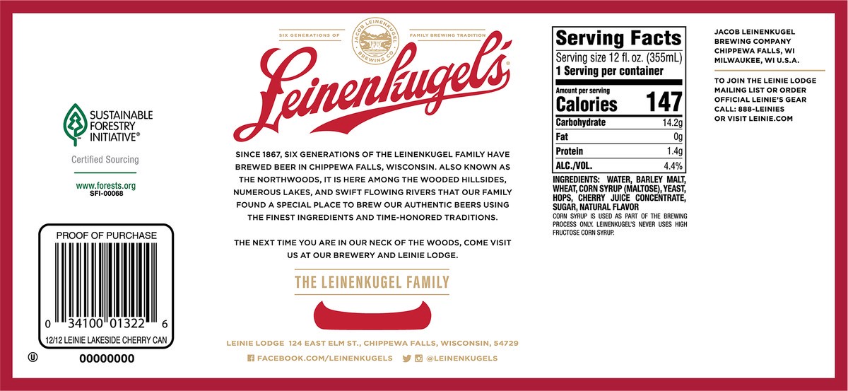 Enjoy crisp, refreshing flavor with Leinenkugel's Lakeside Cherry Lager Craft Beer. Juicy sweetness made with real cherry juice and natural cherry flavor is balanced with a slightly sour bite, mild ca…