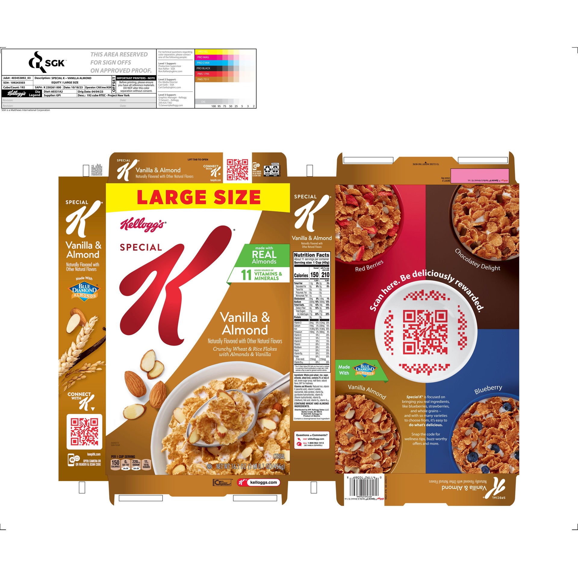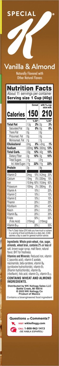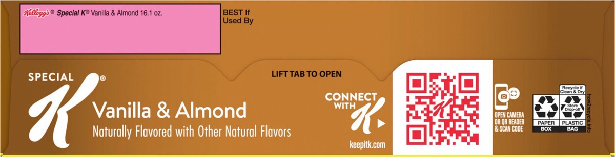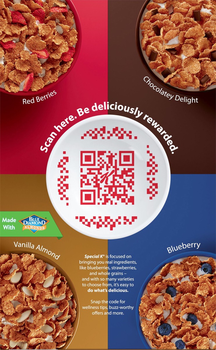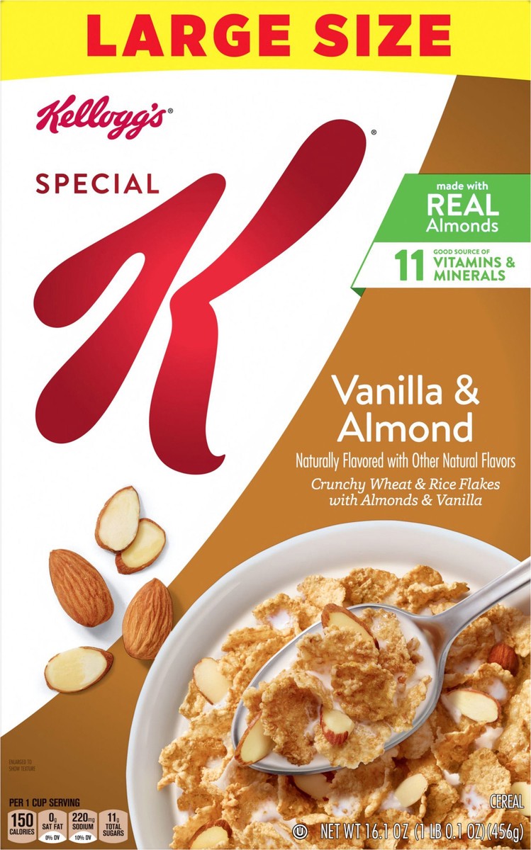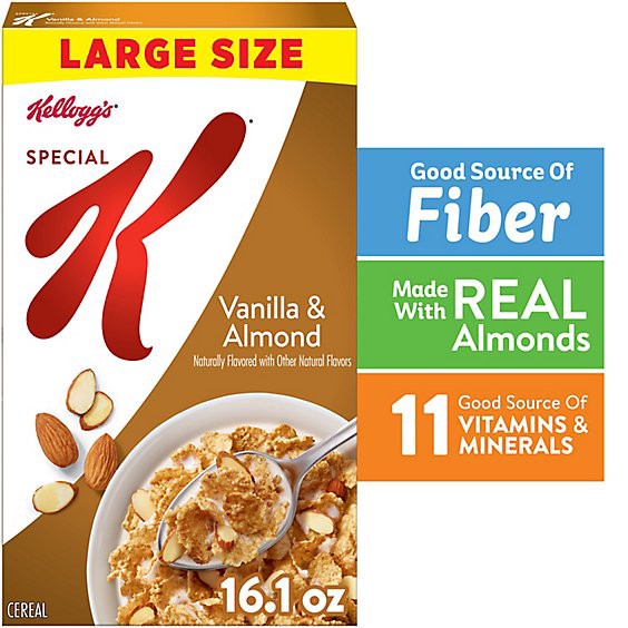 Do what's delicious with Special K Vanilla and Almond, a wholesome breakfast cereal made from tasty ingredients. Crisp, toasted wheat and rice flakes paired with vanilla and sliced real almonds help y…