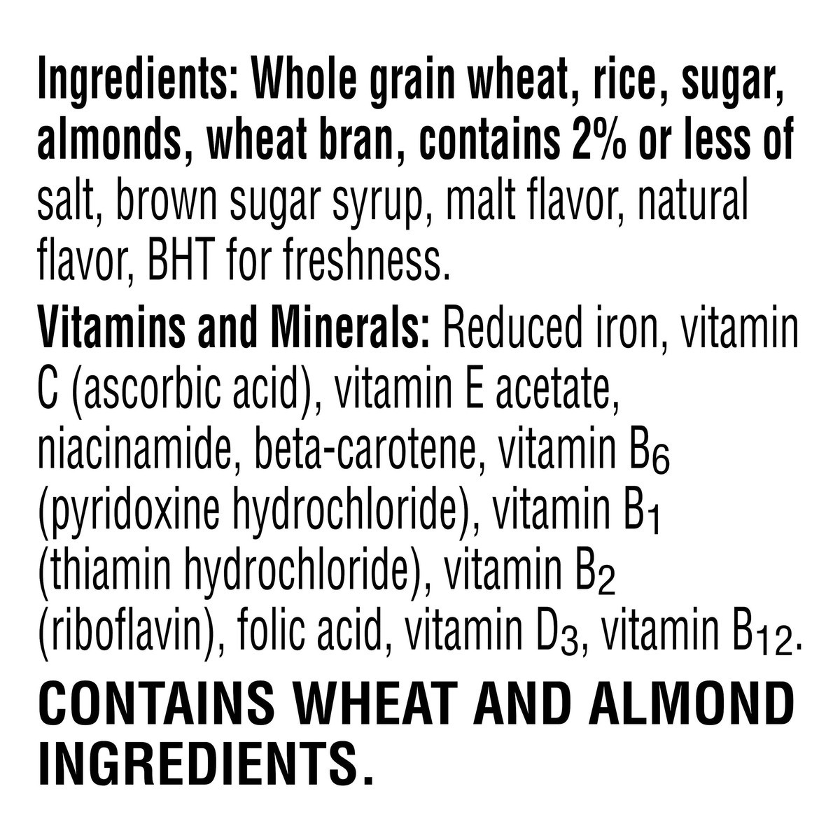Whole Grain Wheat, Rice, Sugar, Almonds, Wheat Bran, Contains 2% or Less of Salt, Brown Sugar Syrup, Malt Flavor, Natural Flavor, BHT for Freshness, Vitamins and Minerals: Reduced Iron, Vitamin C (Asc…