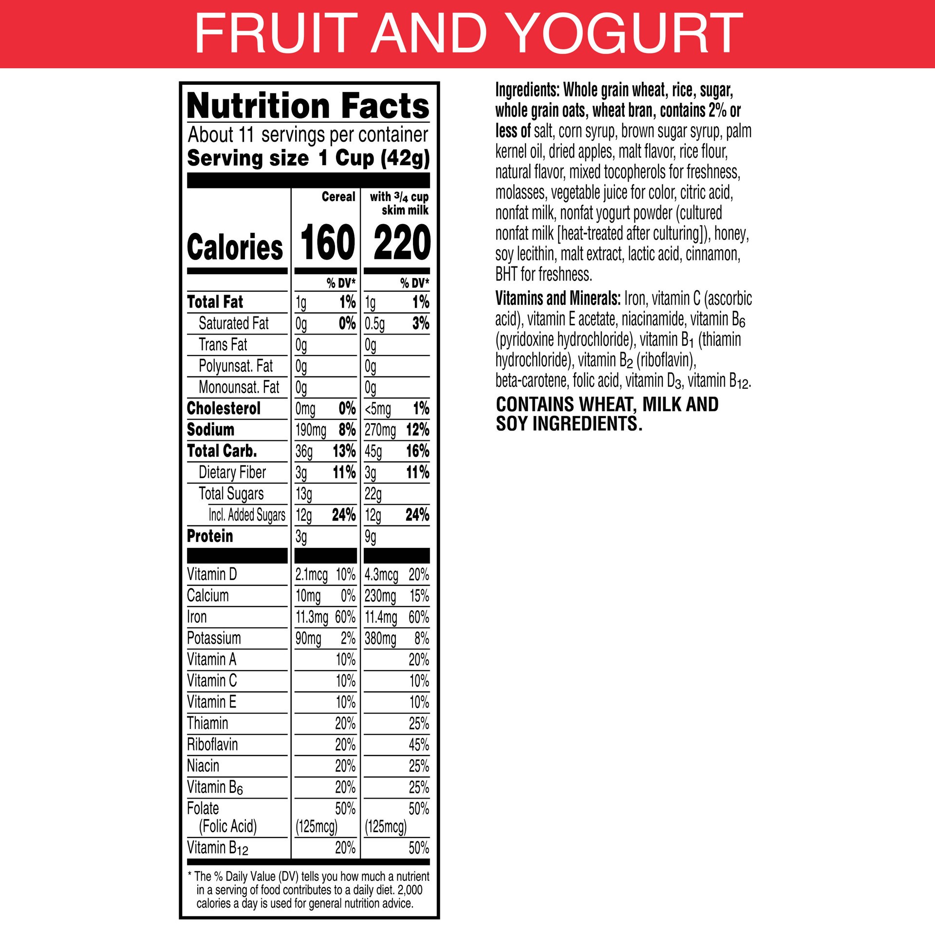 Whole Grain Wheat, Rice, Sugar, Whole Grain Oats, Wheat Bran, Contains 2% or Less of Salt, Corn Syrup, Brown Sugar Syrup, Palm Kernel Oil, Dried Apples, Malt Flavor, Rice Flour, Natural Flavor, Mixed …