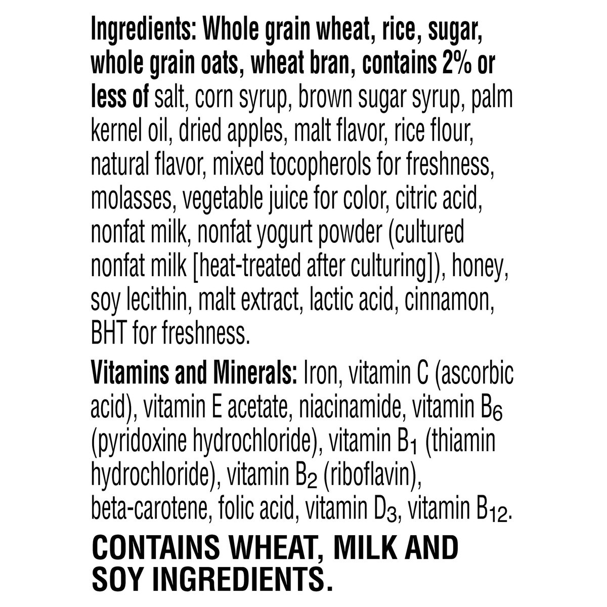 Whole Grain Wheat, Rice, Sugar, Whole Grain Oats, Wheat Bran, Contains 2% or Less of Salt, Corn Syrup, Brown Sugar Syrup, Palm Kernel Oil, Dried Apples, Malt Flavor, Rice Flour, Natural Flavor, Mixed …