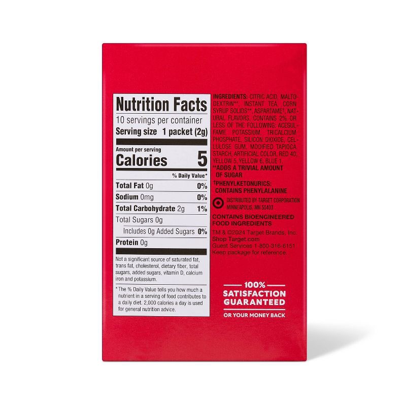 CITRIC ACID, MALTODEXTRIN**, INSTANT TEA, CORN SYRUP SOLIDS**, ASPARTAME , NATURAL FLAVORS, CONTAINS 2% OR LESS OF THE FOLLOWING: ACESULFAME POTASSIUM, TRICALCIUM PHOSPHATE, SILICON DIOXIDE, CELLULOSE…