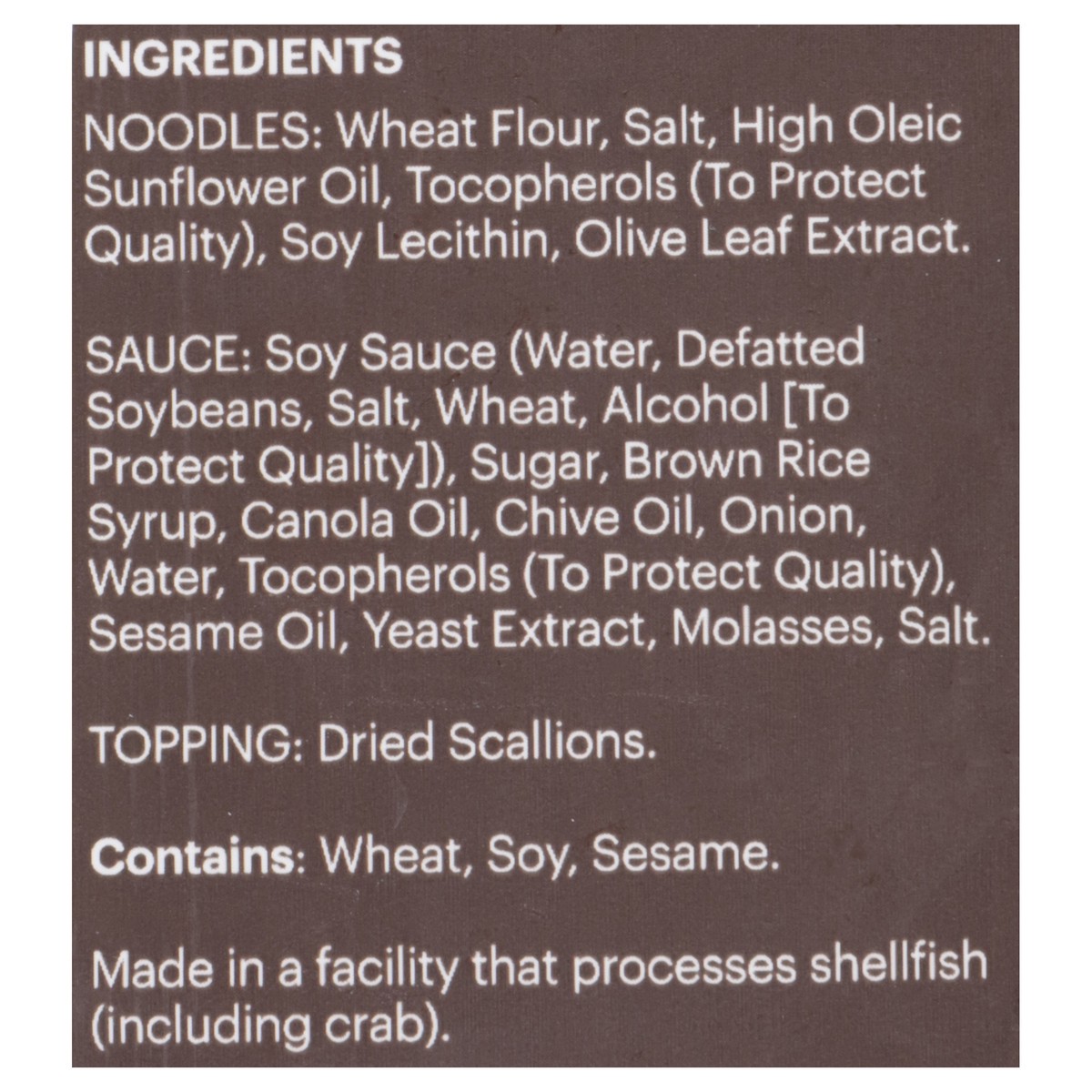 Noodles: Wheat Flour, Salt, High Oleic Sunflower Oil, Tocopherols (to Protect Quality), Soy Lecithin, Olive Leaf Extract, Sauce: Soy Sauce (Water, Defatted Soybeans, Salt, Wheat, Alcohol [to Protect Q…