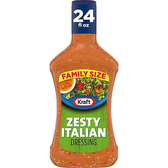 Kraft Zesty Italian Dressing adds deliciously zesty flavor to almost anything. Bursting with tangy vinegar and dried red bell peppers, our family favorite Italian dressing delivers Italian flavor in e…