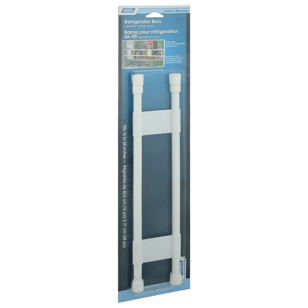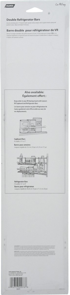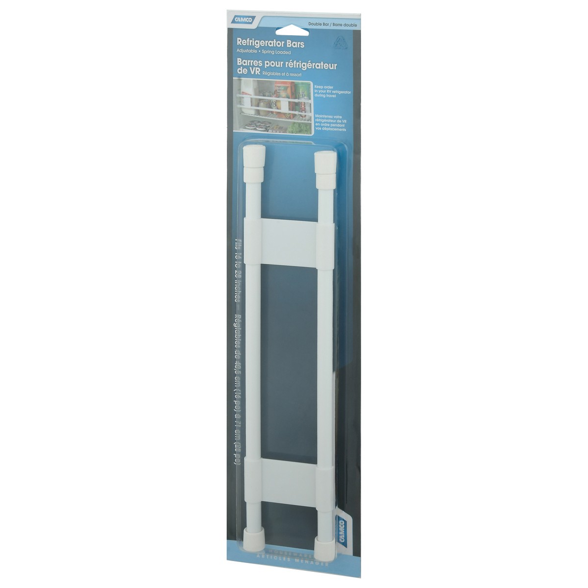 Spring loaded. Keep order in your RV refrigerator during travel. Housewares articles manager. Double Refrigerator Bars: Unscrew extending rods 1/4 inches beyond length required. Gently compress rods i…