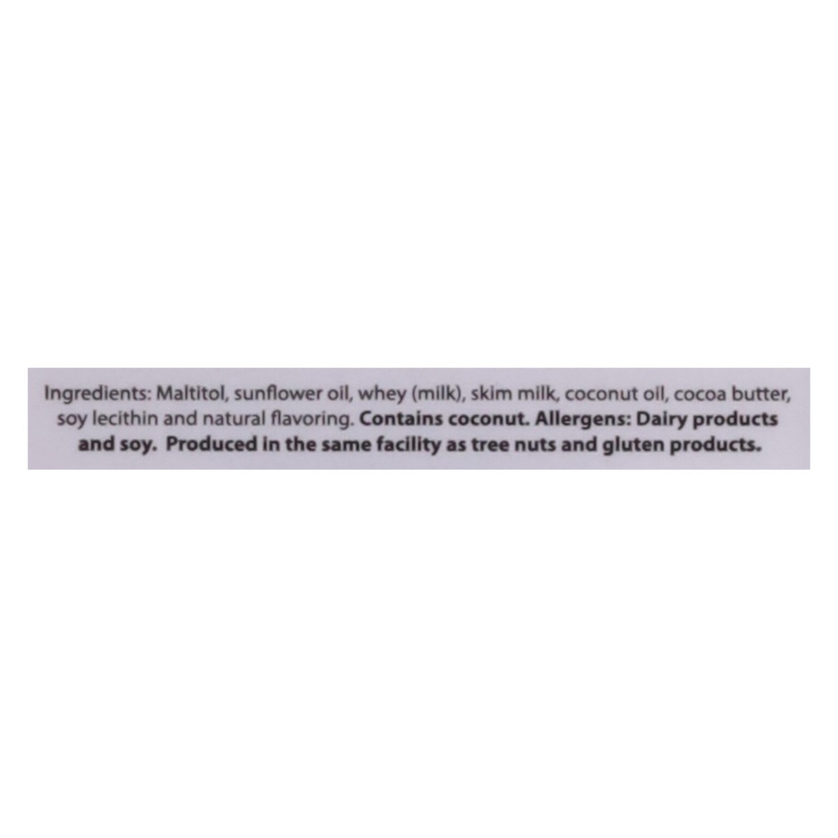 Maltitol, Sunflower Oil, Whey (Milk), Skim Milk, Coconut Oil, Cocoa Butter, Soy Lecithin and Natural Flavoring.