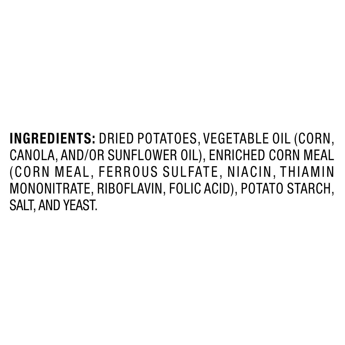 Dried Potatoes, Vegetable Oil (Corn, Canola, and/or Sunflower Oil), Enriched Corn Meal (Corn Meal, Ferrous Sulfate, Niacin, Thiamin Mononitrate, Riboflavin, Folic Acid), Potato Starch, Salt, and Yeast…