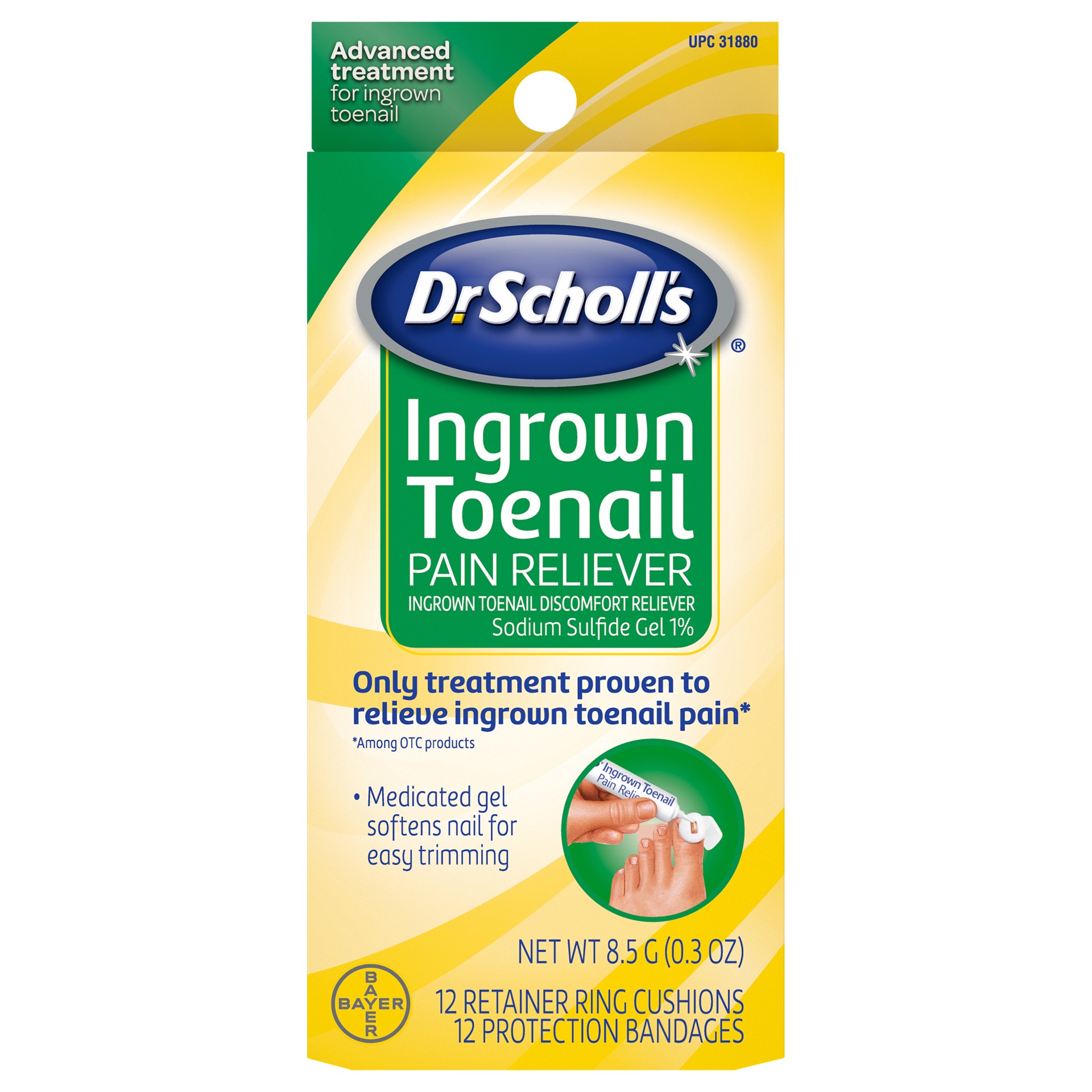 8.5 g (0.3 oz). 12 retainer ring cushions. 12 protection bandages. Advanced treatment for ingrown toenail. Ingrown toenail discomfort reliever. Sodium sulfide gel 1%. Only treatment proven to relieve …