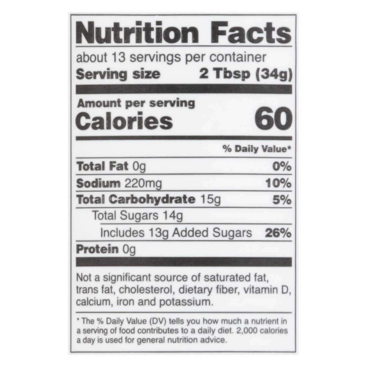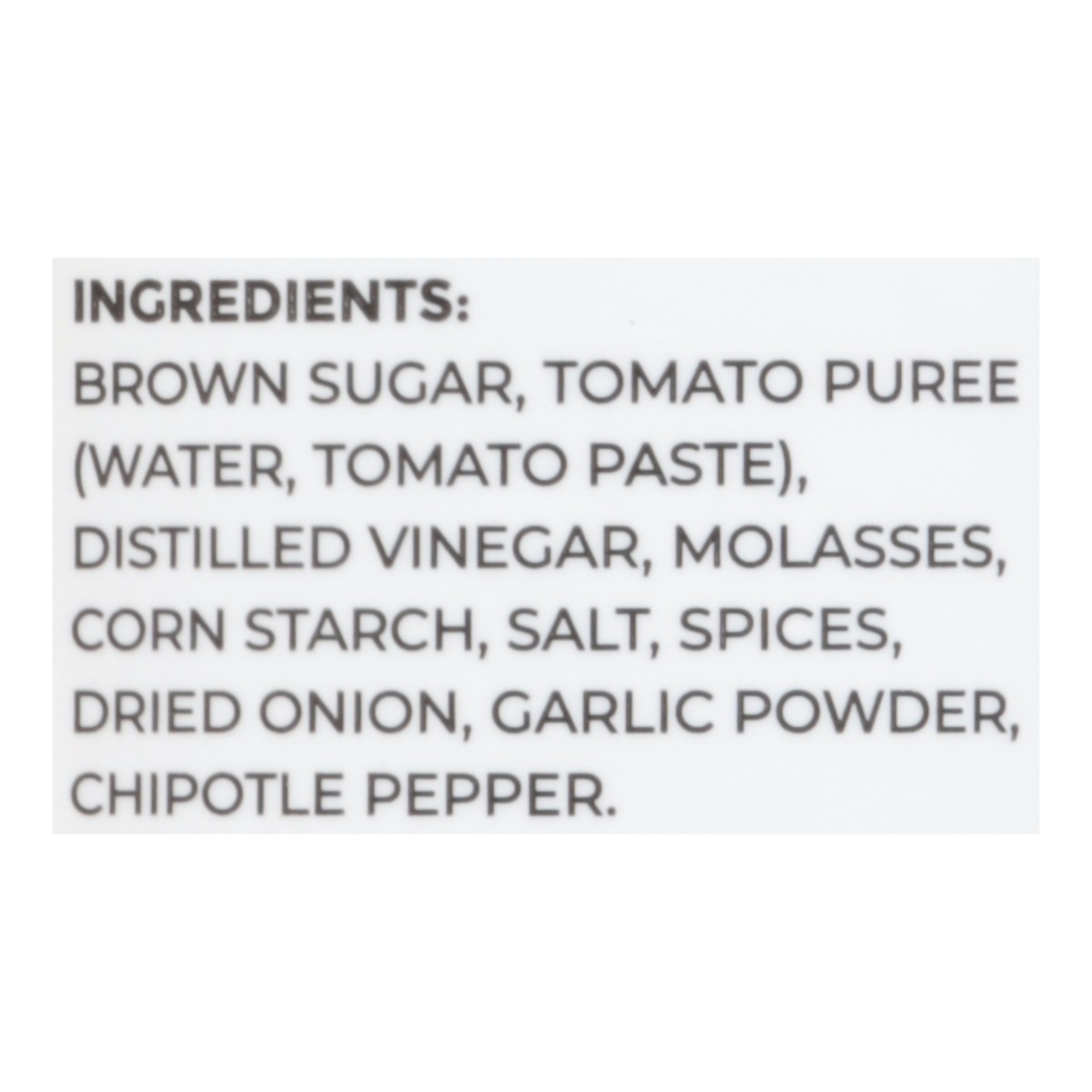 Brown Sugar, Tomato Puree (Water, Tomato Paste), Distilled Vinegar, Molasses, Corn Starch, Salt, Spices, Dried Onion, Garlic Powder, Chipotle Pepper.