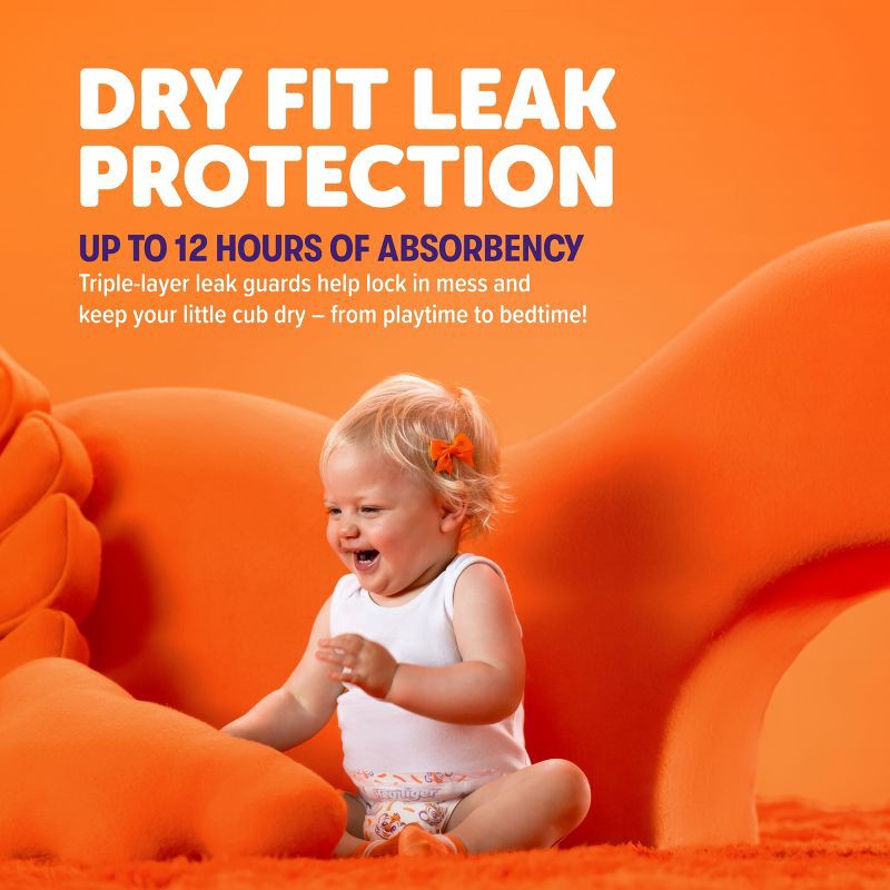 - DryFit™ Leak Protection and triple-layer elastic leak guards help lock in mess and keep your little cub dry — from playtime to bedtime.