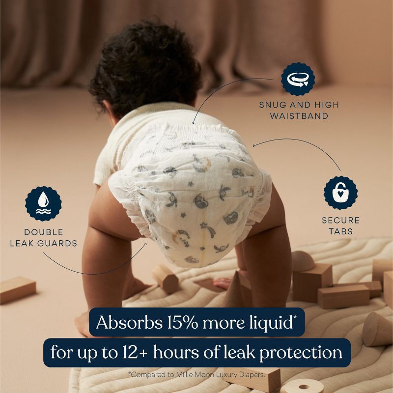 - Absorbs up to 15% more liquid than Millie Moon Luxury Diapers.
