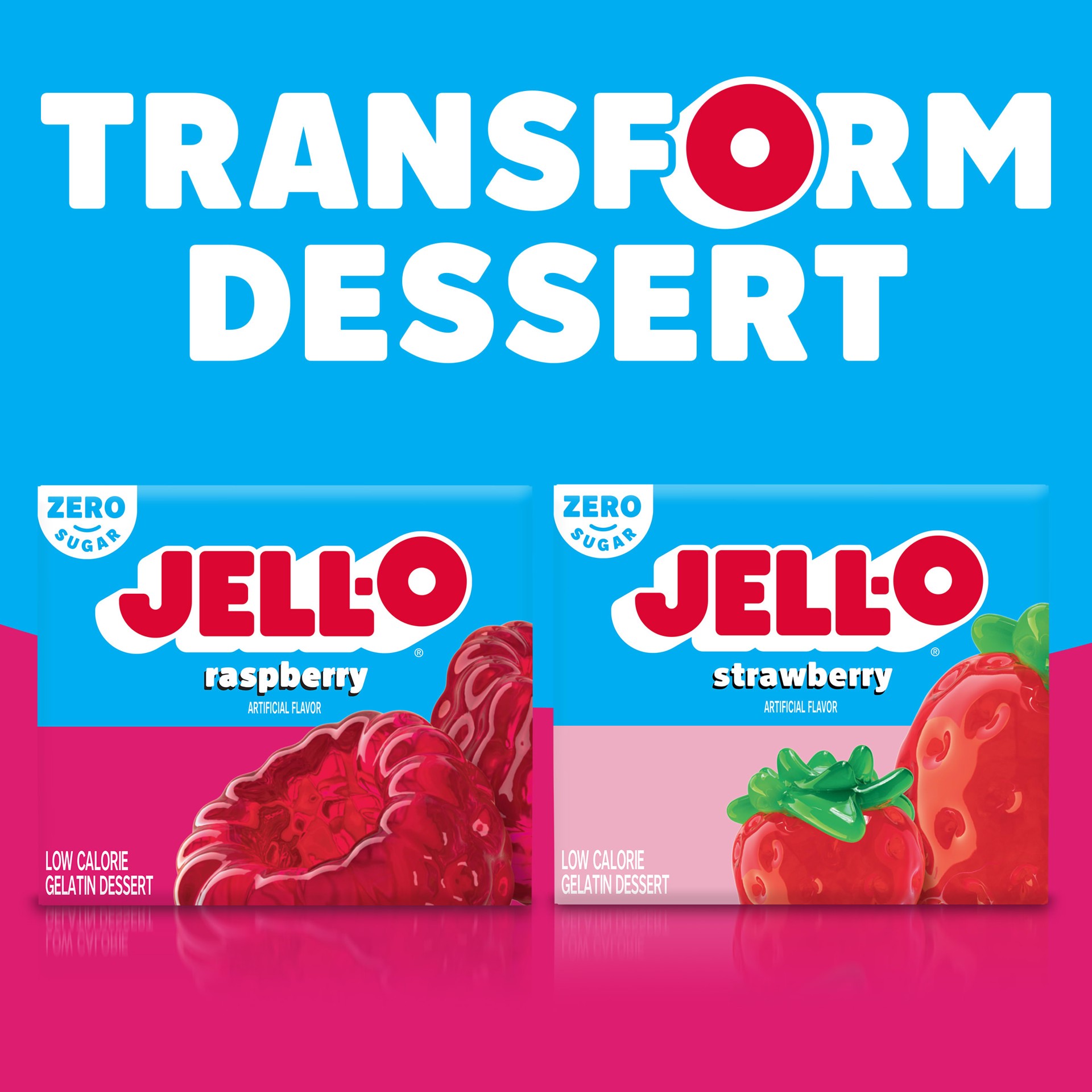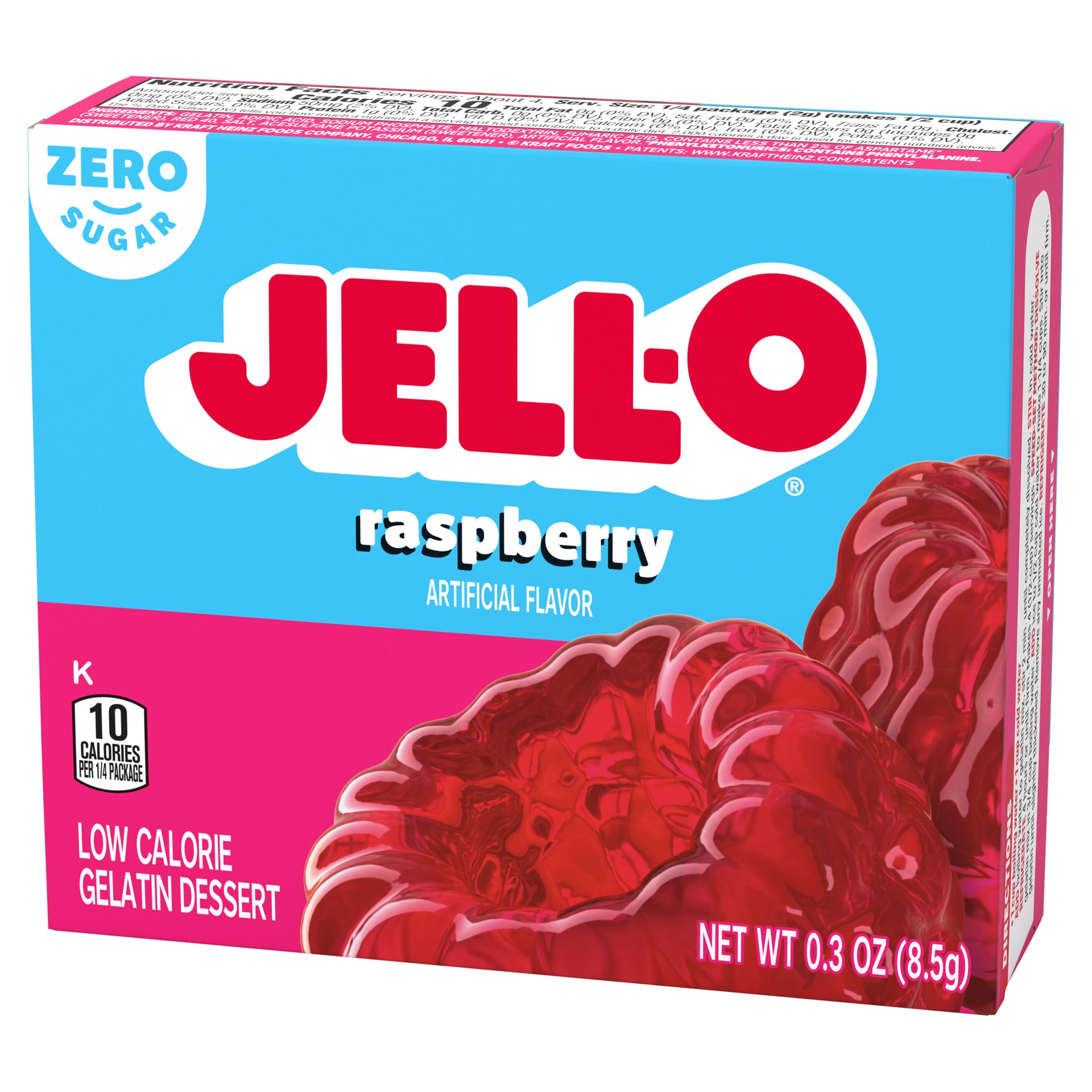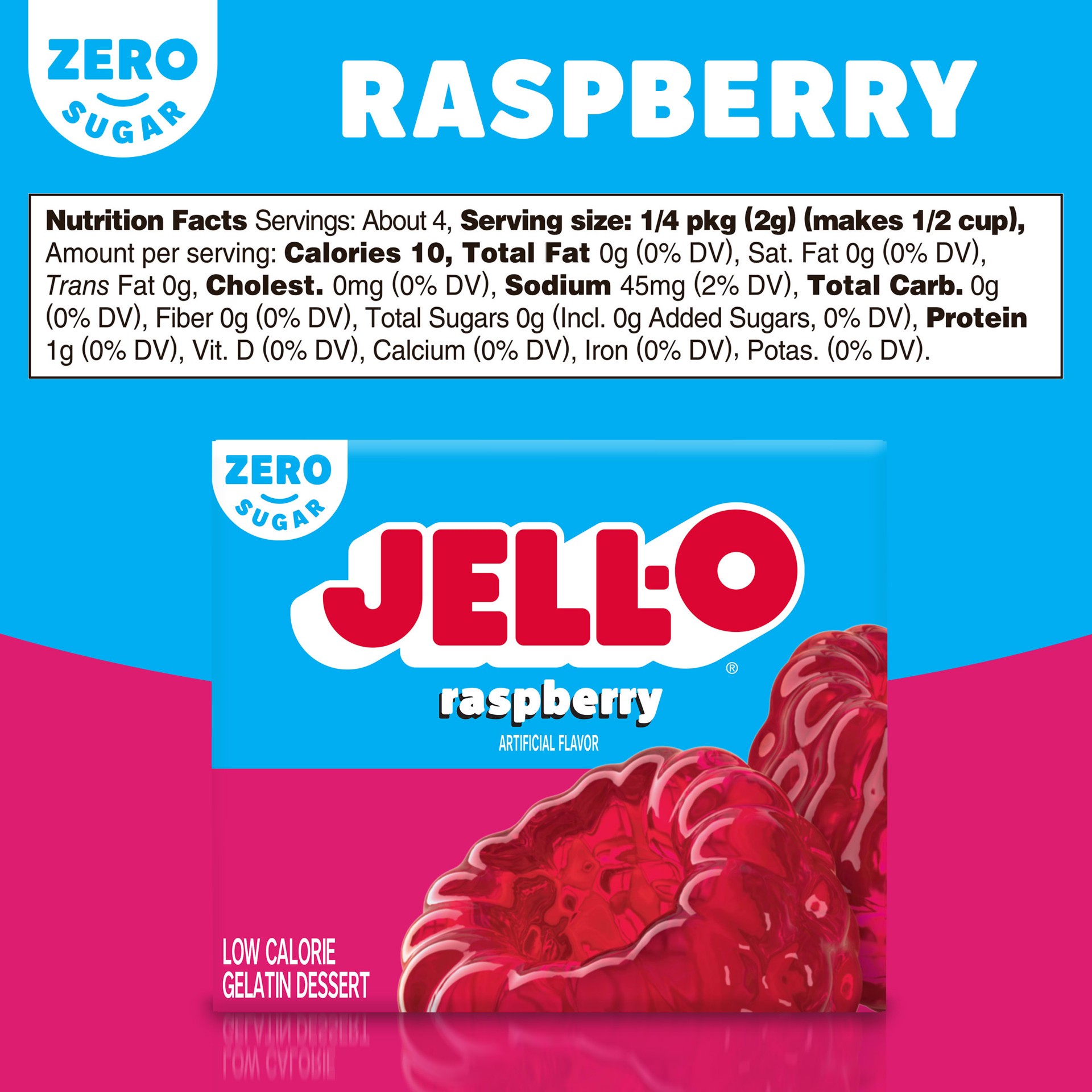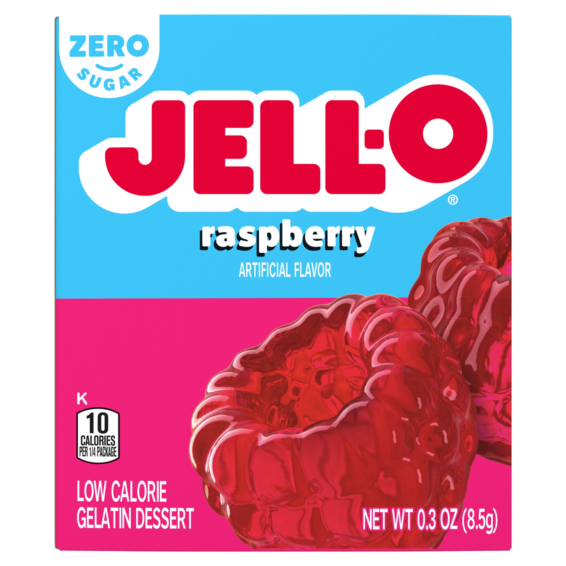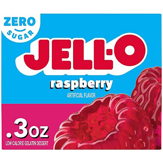 Snack happy. Jell-O Raspberry Artificially Flavored Zero Sugar Gelatin Dessert Mix lets you add some wonder to your day with a fun snack. Spoon up a smile with our zero sugar artificially flavored ras…