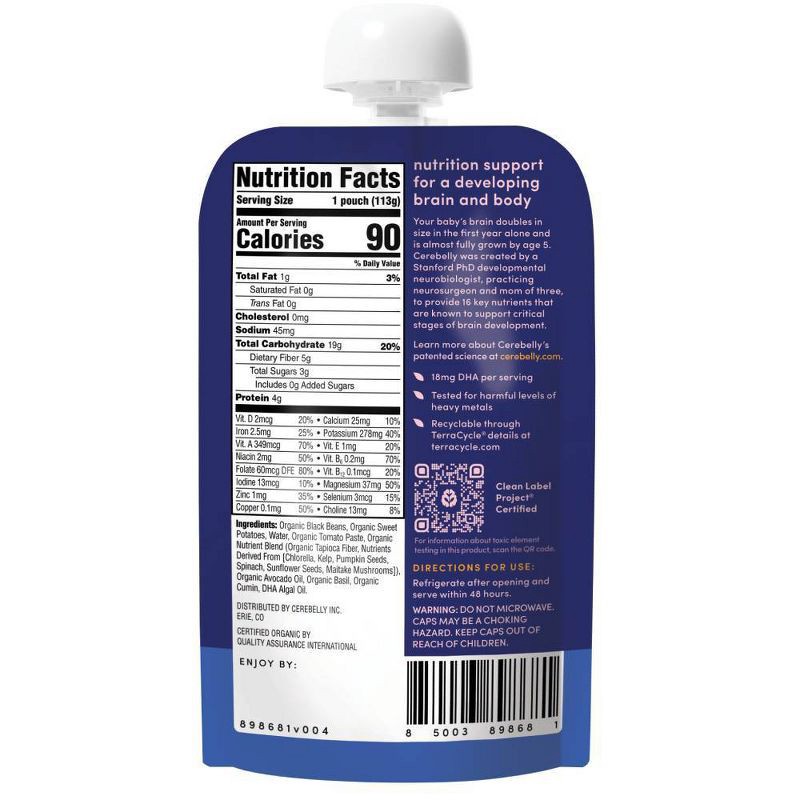 Cerebelly Organic Baby Food Single Pouch Baby Meal - Black Bean Sweet Potato with Avocado and Tomato - 4oz: Age 5+ Months, 2nd Stage Pureed